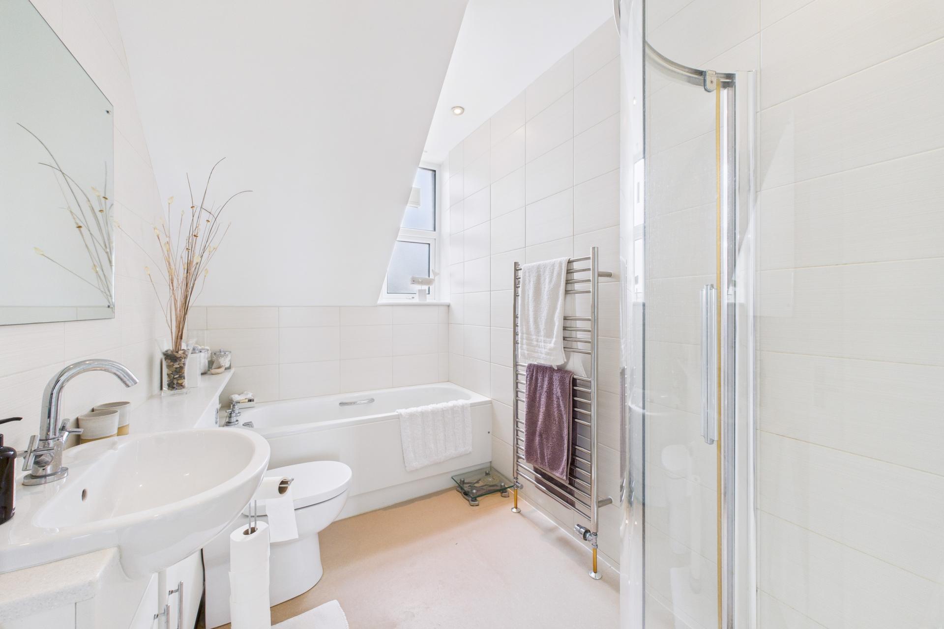 Walk in corner shower cubicle with mains connected shower inset, wash hand basin with storage under, enclosed WC, panelled bath, heated towel rail, opaque double glazed window to the front, part tiled walls