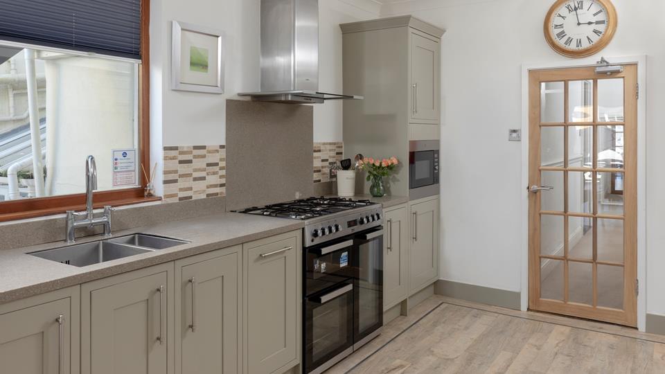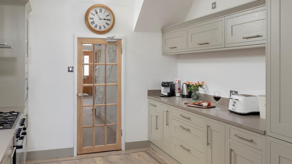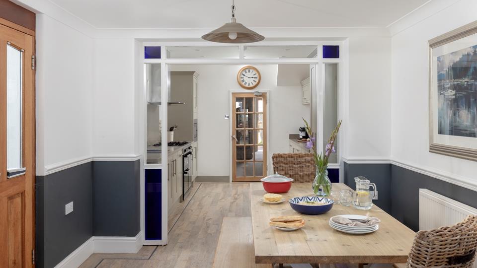 Beautifully appointed semi-open plan kitchen with an excellent range of modern units with ample worktop surfaces over, large range style oven and hob with extractor fan over, integrated dishwasher, integrated fridge / freezer, inset stainless steel one and quarter sink, ample power points, washing machine. The kitchen in turn leads into a Dining Area