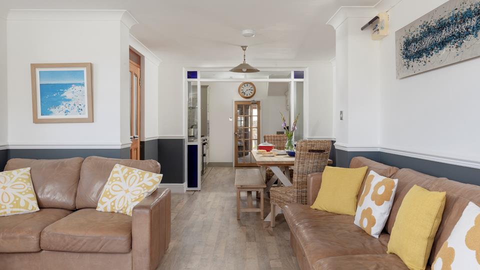 Ample seating space for six, again in turn open plan into, window to the side and double doors opening out to a lovely rear decked area. Power points, TV points