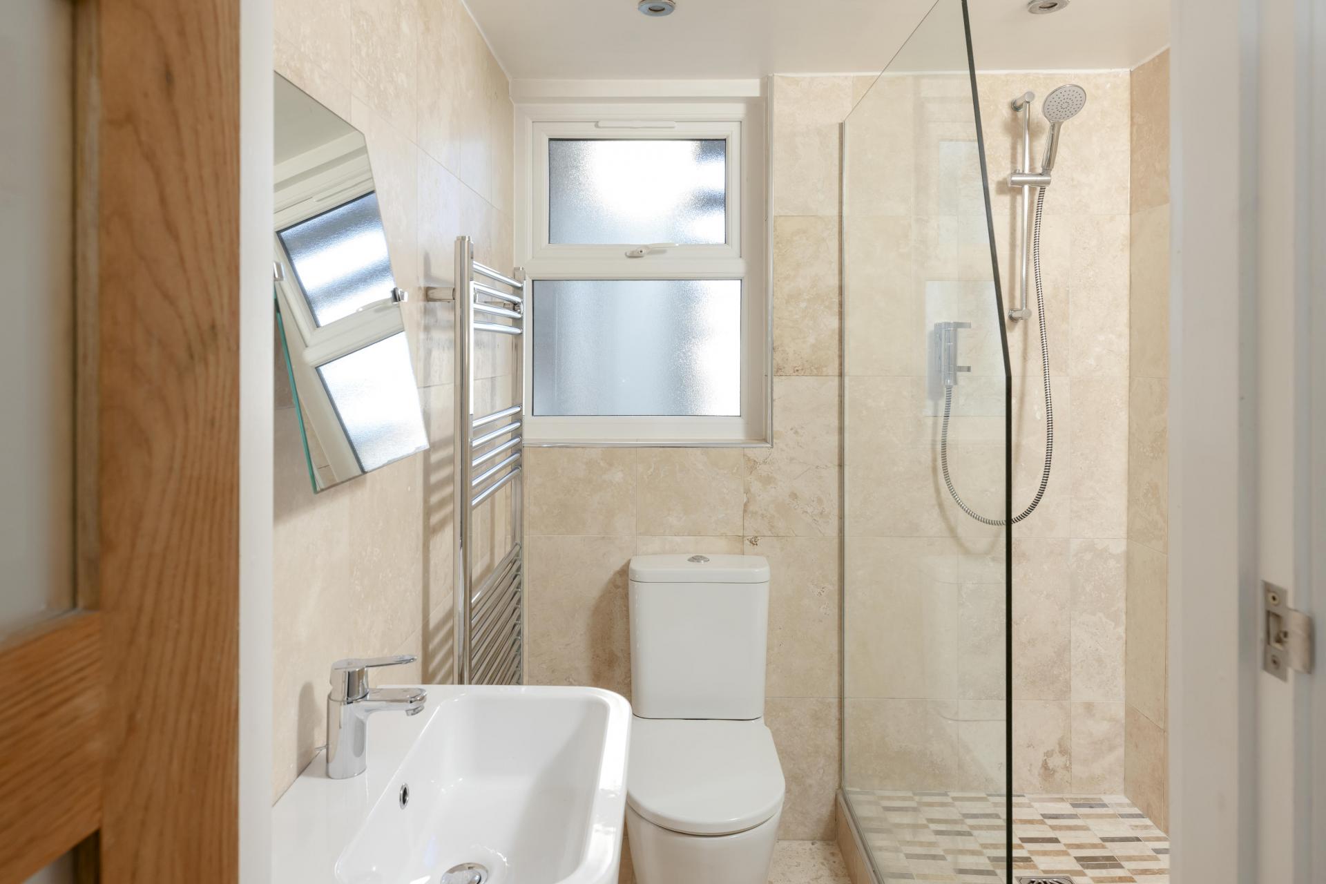 Fully tiled floor and walls, large walk in shower cubicle with mains connected shower, close coupled wc and wall hung wash hand basin. Frosted window to the rear