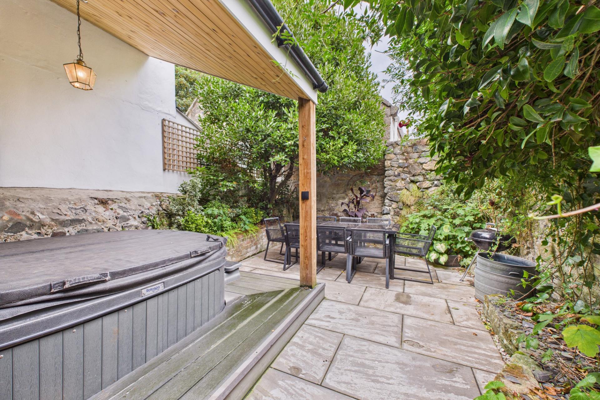 To the rear is absolute delight. Offering a serene and spacious walled garden that feels very Mediterranean. With paving, outdoor lighting, various mature and sub tropical plants, shrubs and trees. There is a covered hot tub area and ample room to seat 8 for alfresco dining or just enjoying some peace and quiet