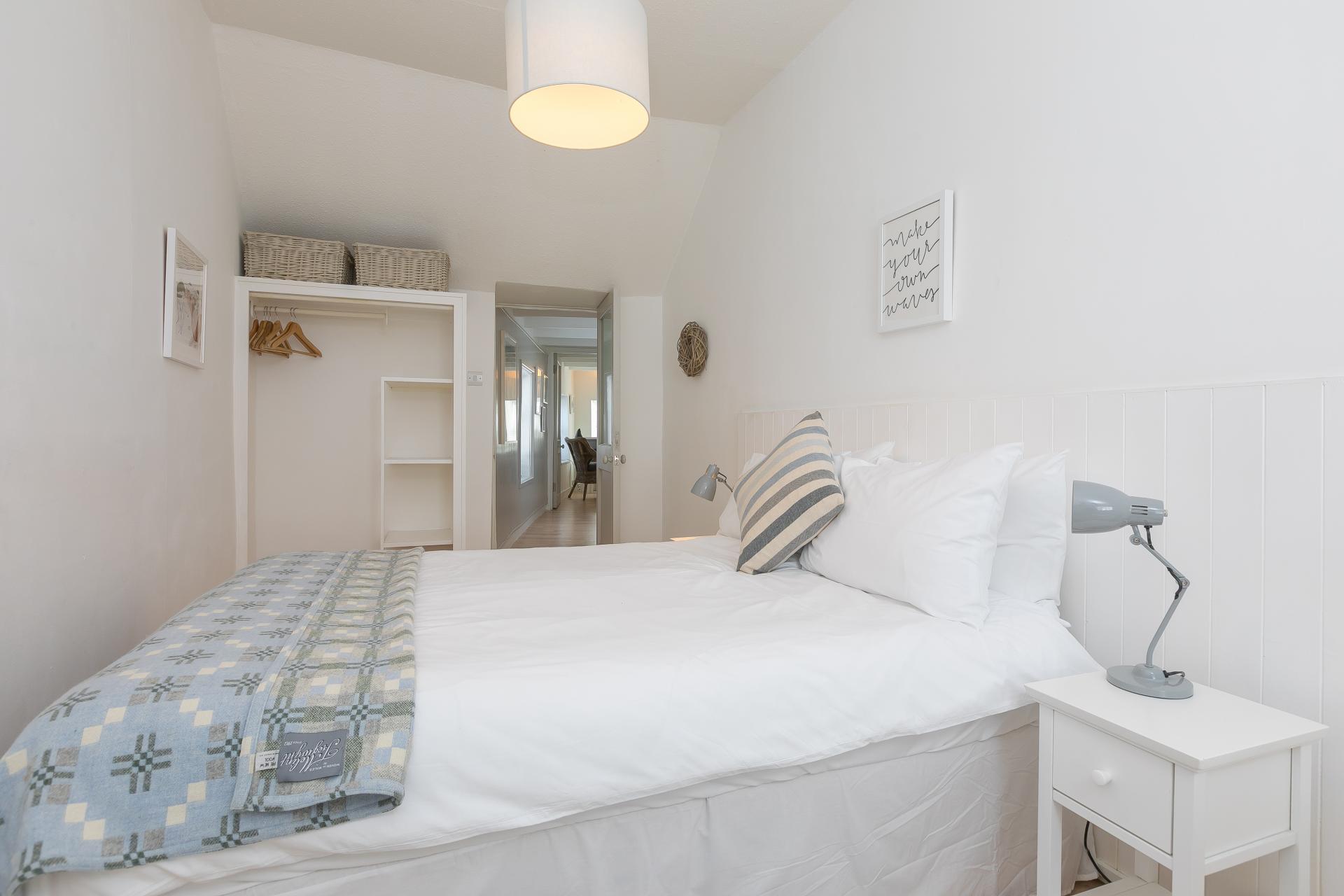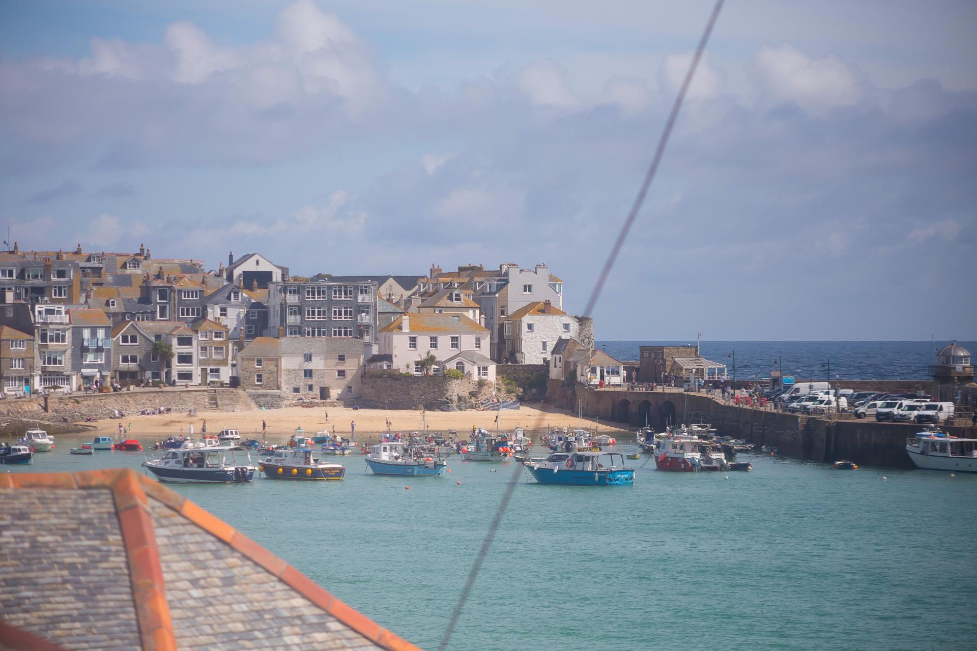 Another beautiful room with beamed ceiling, triple aspect windows to the rear and side, the side in particular offering lovely and surprising views over towards the famous St Ives harbour, radiator, power points, TV point, electric log burner effect stove