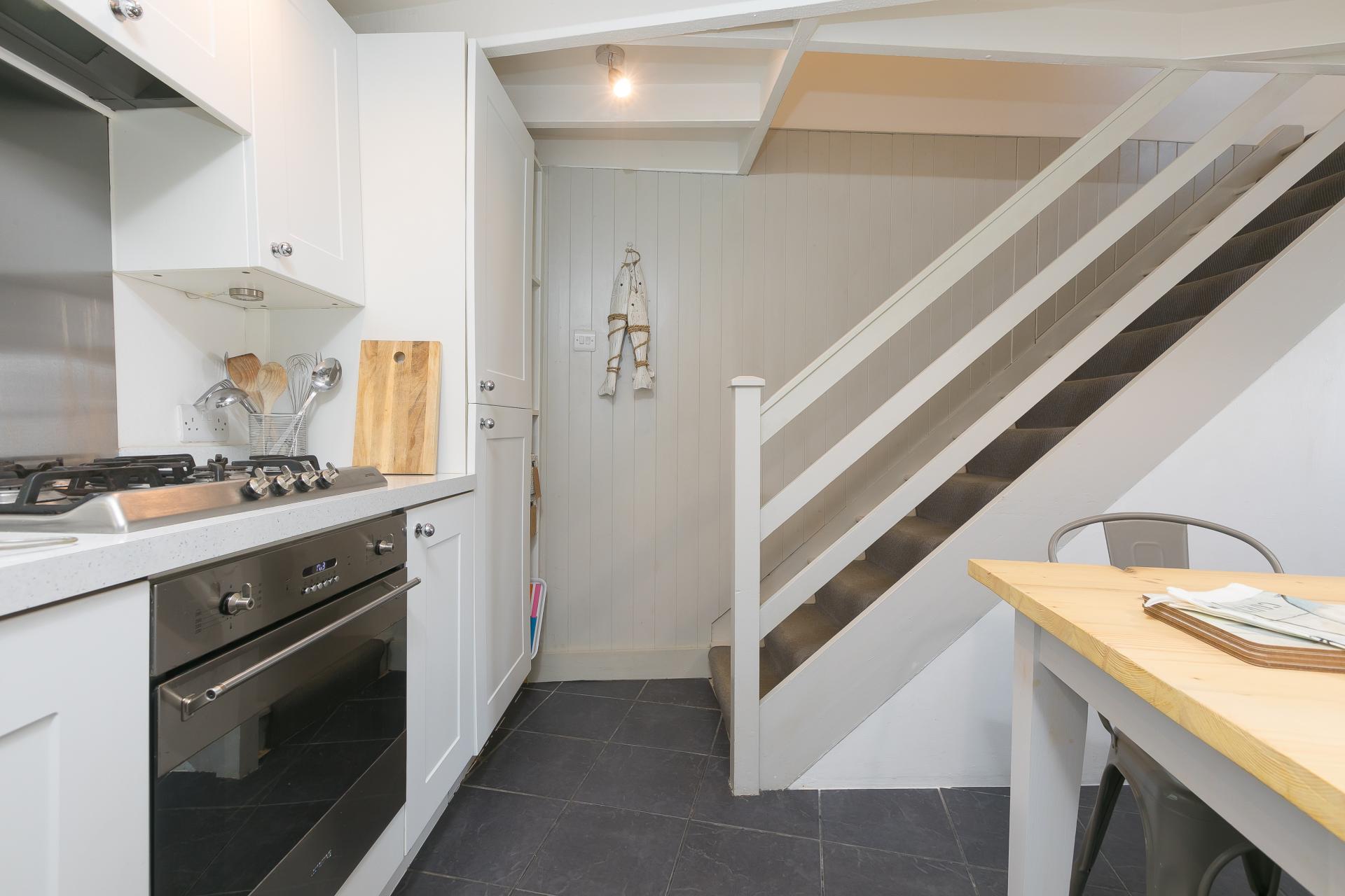 Beautifully appointed kitchen, great sized with tiled flooring, stairs to first floor, double glazed wood framed window to the side. Extensive range of modern eye and base level units with ample worktop space over, inset stainless steel sink unit with mixer taps over, 4 ring gas hob with electric oven under and extractor fan over, integrated washing machine / dryer, integrated fridge / freezer and integrated dishwasher, understairs cupboard, beamed ceiling and ample power points, radiator, door to