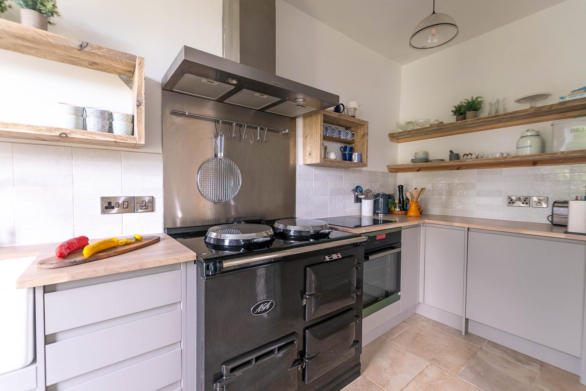 Galley style kitchen with the continuation of the tiled flooring, newly fitted kitchen with base level soft close units, quartz worktop surfaces, large ceramic butler sink unit with swan neck taps, fitted electric Aga with stainless steel splashback and extractor over, integrated fridge and integrated dishwasher, 4 ring induction electric hob and electric oven under, multi paned sash window to the front with a fine view