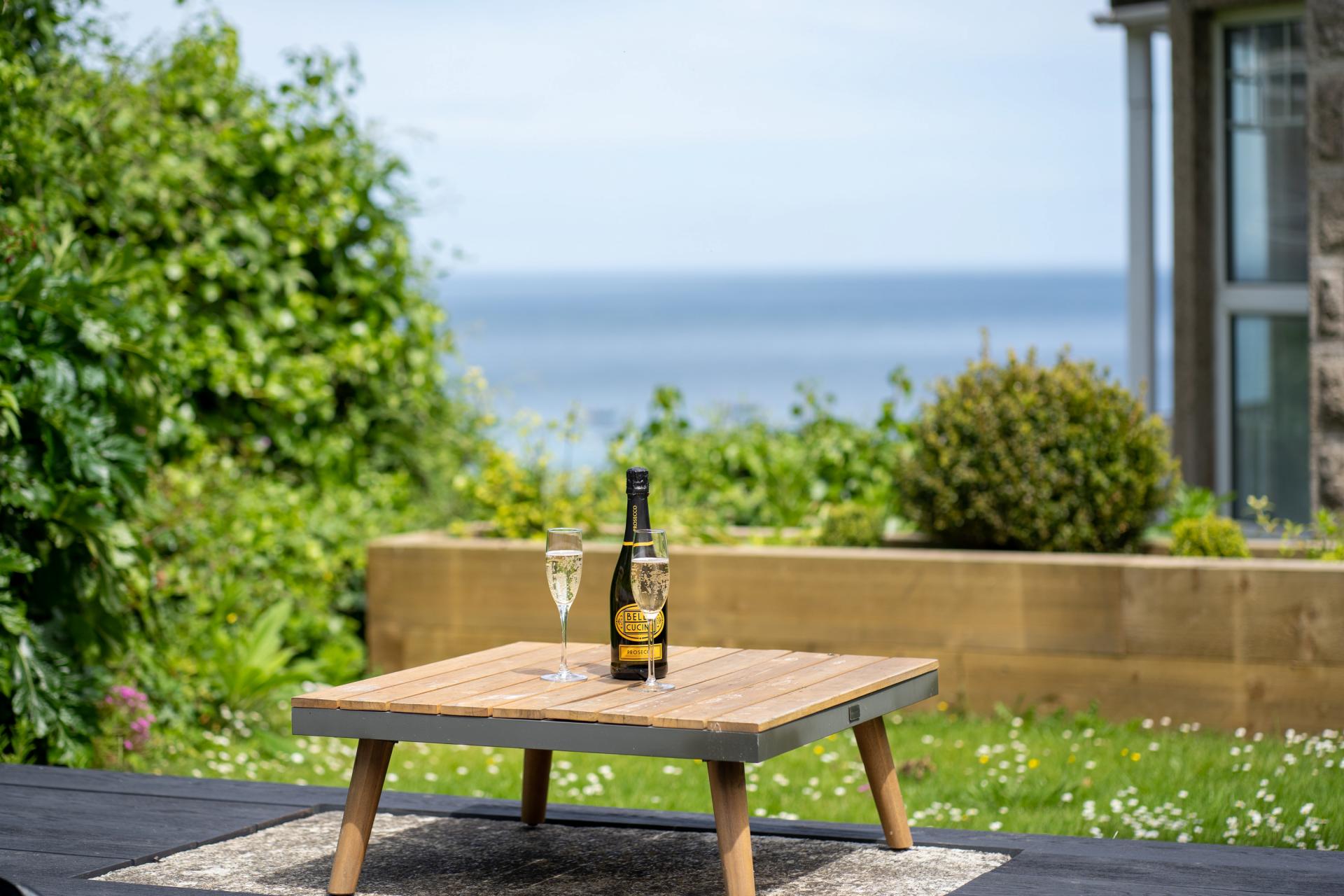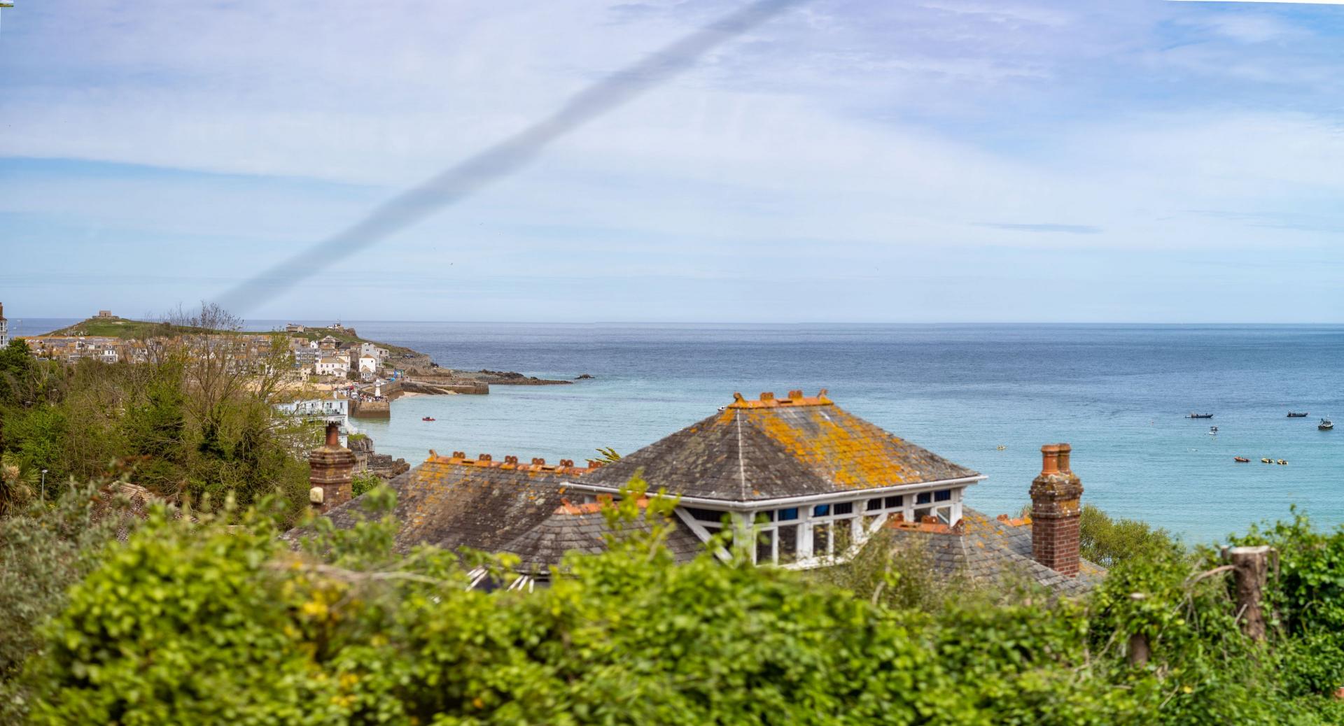 The front gardens are laid to lawn with central planting area and bordered by fencing on one side and Cornish stone hedging and trees on the other. There is a lovely seating / patio area and at the end of the garden you get great views down over to Porthminster.