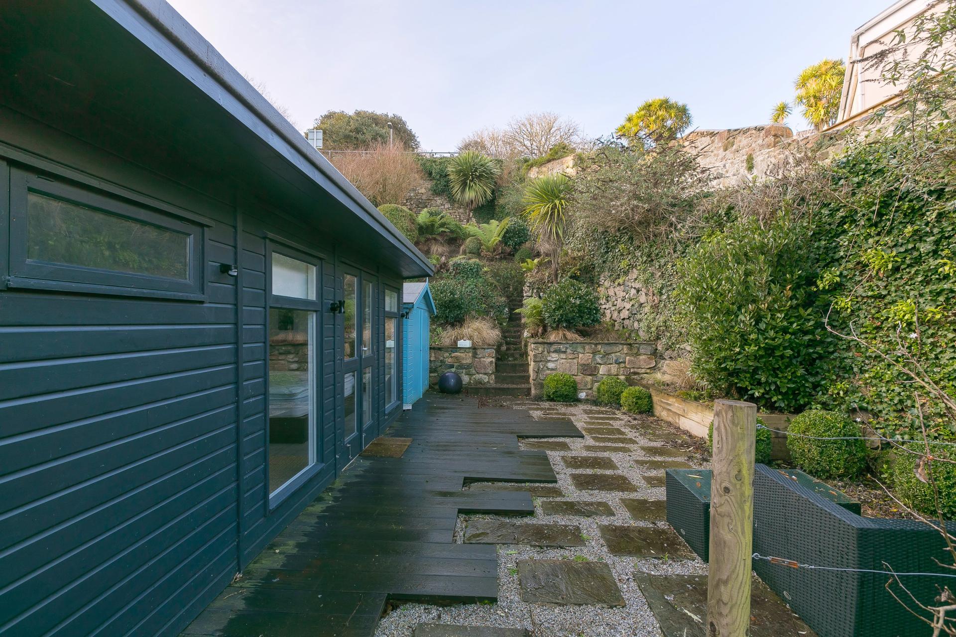 Outside the summer house and from the side is a mix of hardwood decking boards and patio slabs with gravel inset, this in turn leads up to the tiered garden with steps leading to the top and a excellent array of mature shrubs and plants.