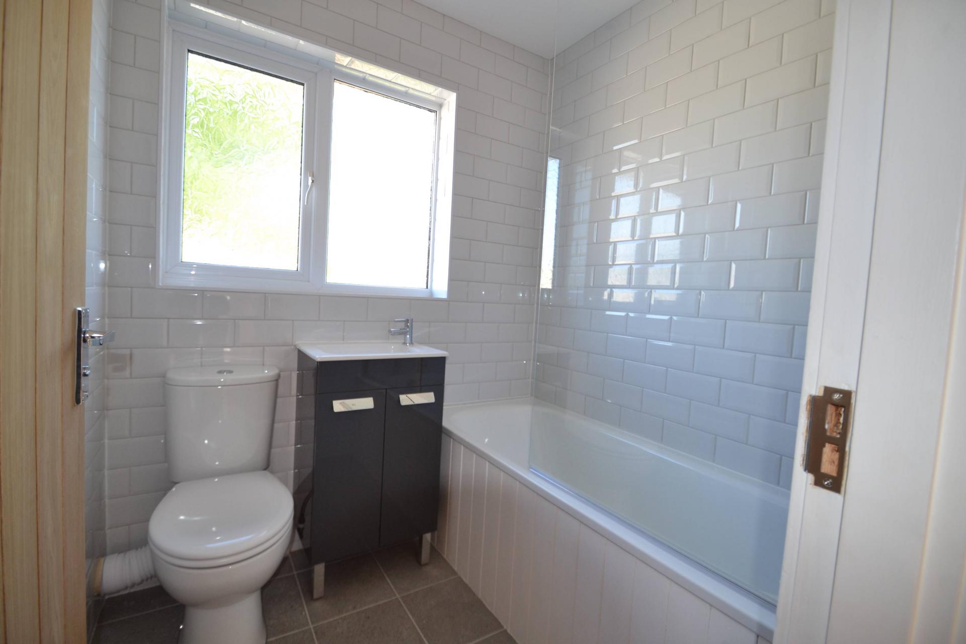 Pale grey coloured brick effect fully tiled walls and contemporary concrete tiled flooring with underfloor heating. Roca sink and vanity unit with mixer taps over, close coupled WC with push button flush, panelled bath with mixer taps and mains connected shower over, extractor fan with motion sensor, space for electric heated towel rail, double glazed patterned window to the rear.