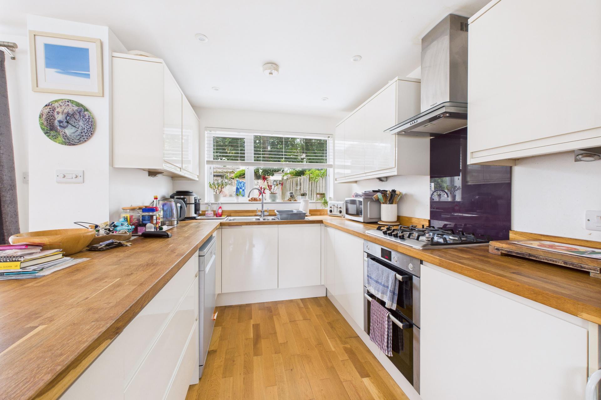 Kitchen comprises an excellent range of fitted eye and base level units in cream gloss with natural oak worktop surfaces over, stainless steel 4 ring Bosch gas hob with double electric oven under, purple glass splashback with stainless steel and glass extractor fan hood and light over. One and quarter sink unit with drainer and mixer taps over, plumbing for washing machine and space for fridge freezer, UPVC double glazed window overlooking the rear. Ample power points oak splashback and under unit lighting