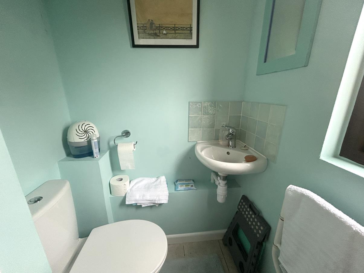 Cloakroom - With W.C., wall mounted wash handbasin with tiled splashback, window to the rear aspect, heated towel rail, extractor and tiling to the floor.