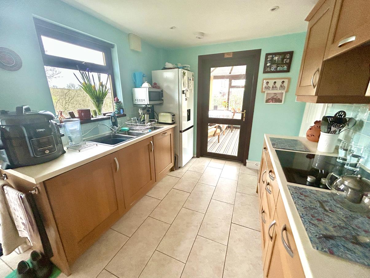 Kitchen - 3.4m x 2.6m (11'1" x 8'6" ) - With a wood effect fitted kitchen comprising stone effect worktops that incorporate a one and a half bowl stainless steel sink drainer with mixer tap, which have tiled splash backs. There are a mixture of base and drawer units under with wall units over, an integrated double oven, washer/drier and a dishwasher. There is a pantry cupboard, slide out tall pantry unit, a space is provided for a fridge/freezer, tilling to the floor, under floor heating and a window that enjoys a lovely aspect over the garden. Glazed door to -