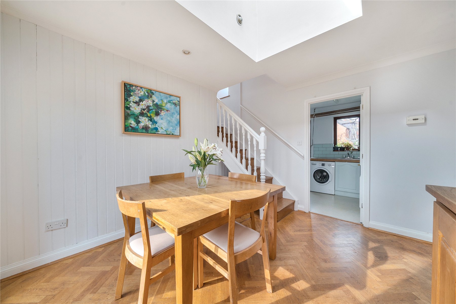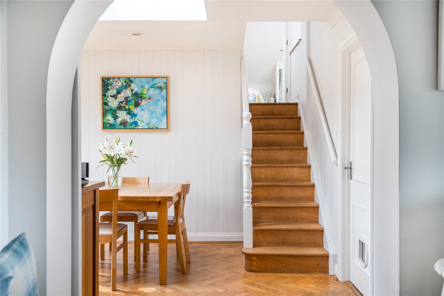 An archway leads seamlessly into the dining room, offering ample space for a table and chairs. Wood block flooring continues, and natural light streams in through a double glazed window, front door, and skylight. Stairs rise from this area to a first-floor bedroom, while a door leads through to the utility room.