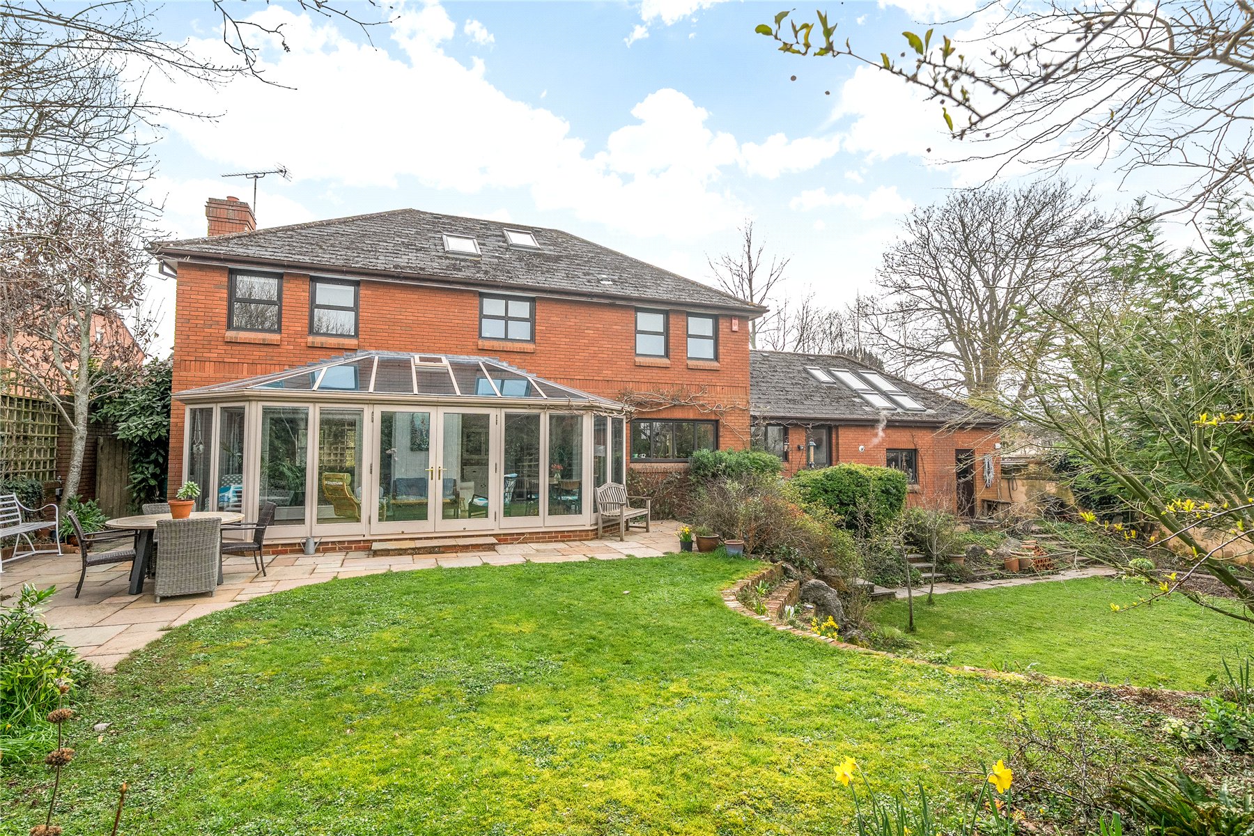 To the rear, a large patio adjoins the house, ideal for outdoor dining and entertaining, connecting directly to the conservatory and family room. Beyond this lies a lawned garden with well-planted borders and a walled boundary, offering privacy and a sense of tranquillity. Steps lead down to a lower garden area with a larger lawn, planted borders, fruit and vegetable growing areas, a greenhouse, and access to the garage via a courtesy door.