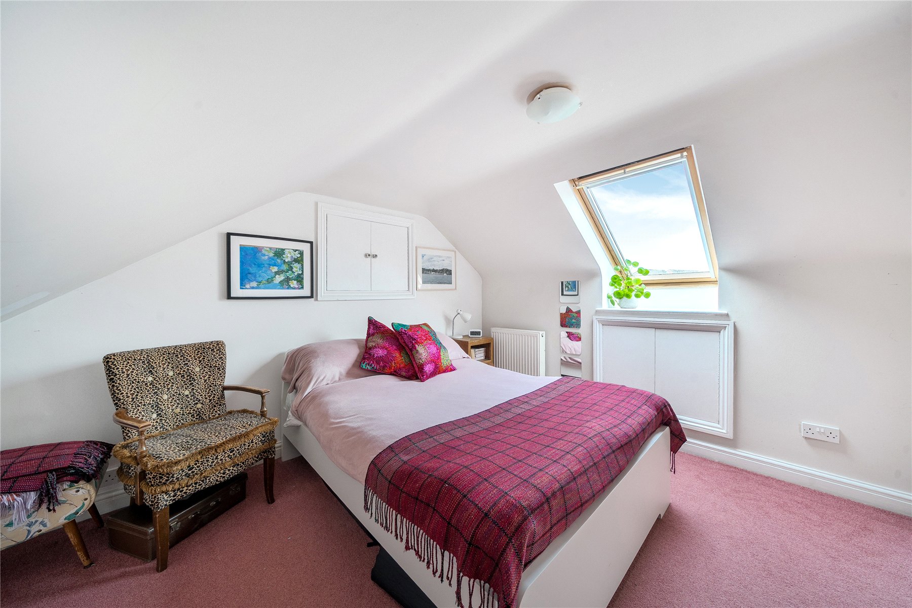 Stairs rise to the second-floor landing, which has a skylight and storage cupboard, leading to the fifth double bedroom with two skylights, eaves storage, and a radiator.