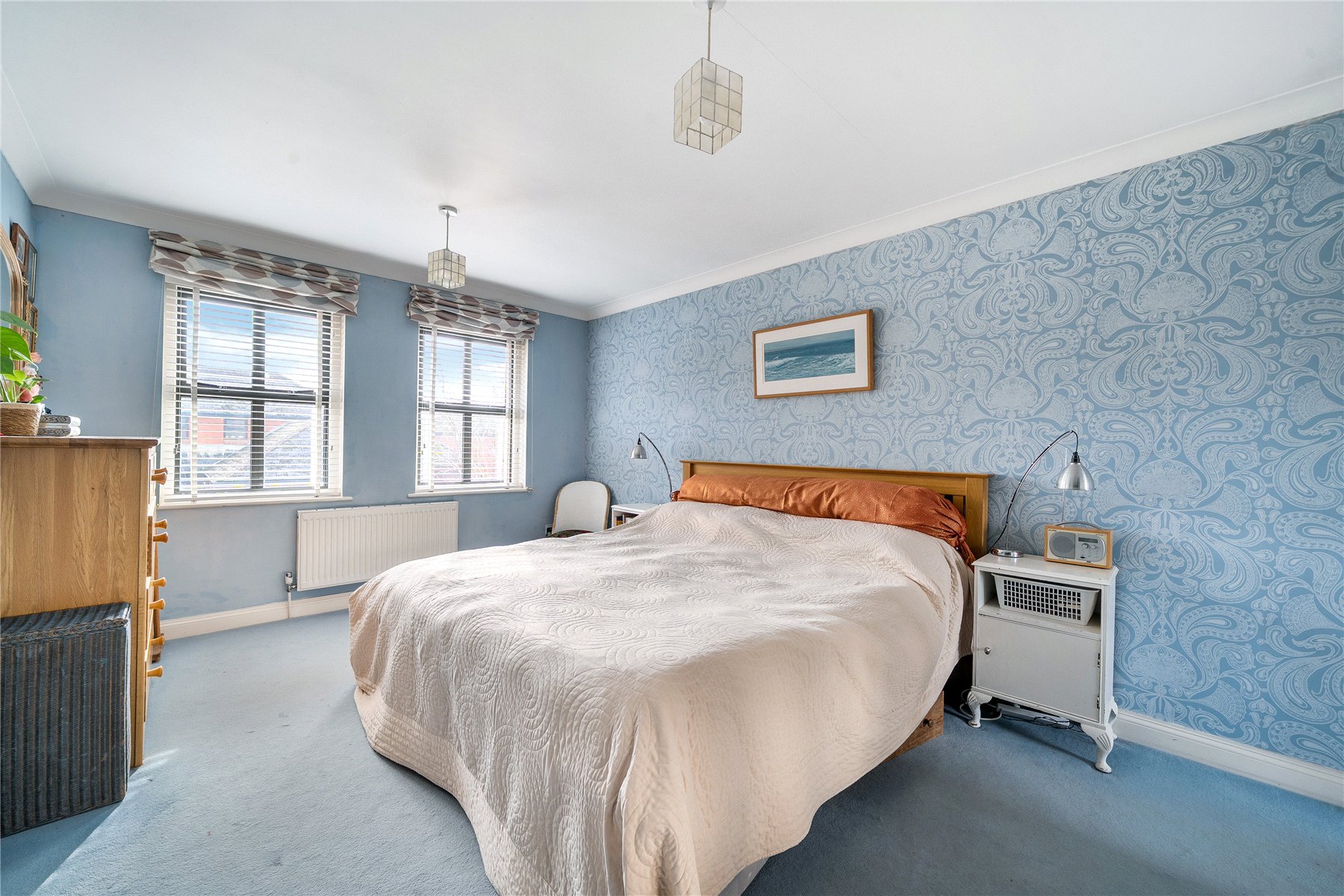 The principal bedroom is a particularly generous space with two front-facing double glazed windows and a comprehensive range of fitted mirror-fronted wardrobes. A radiator is fitted, and the en suite bathroom is luxuriously appointed with a pedestal wash hand basin with mixer tap, low-level WC, panelled bath with mixer tap and shower attachment, and a separate tiled shower enclosure with mains shower and glazed screen. Oak flooring, a radiator, heated towel rail, and two obscure windows complete this elegant suite.