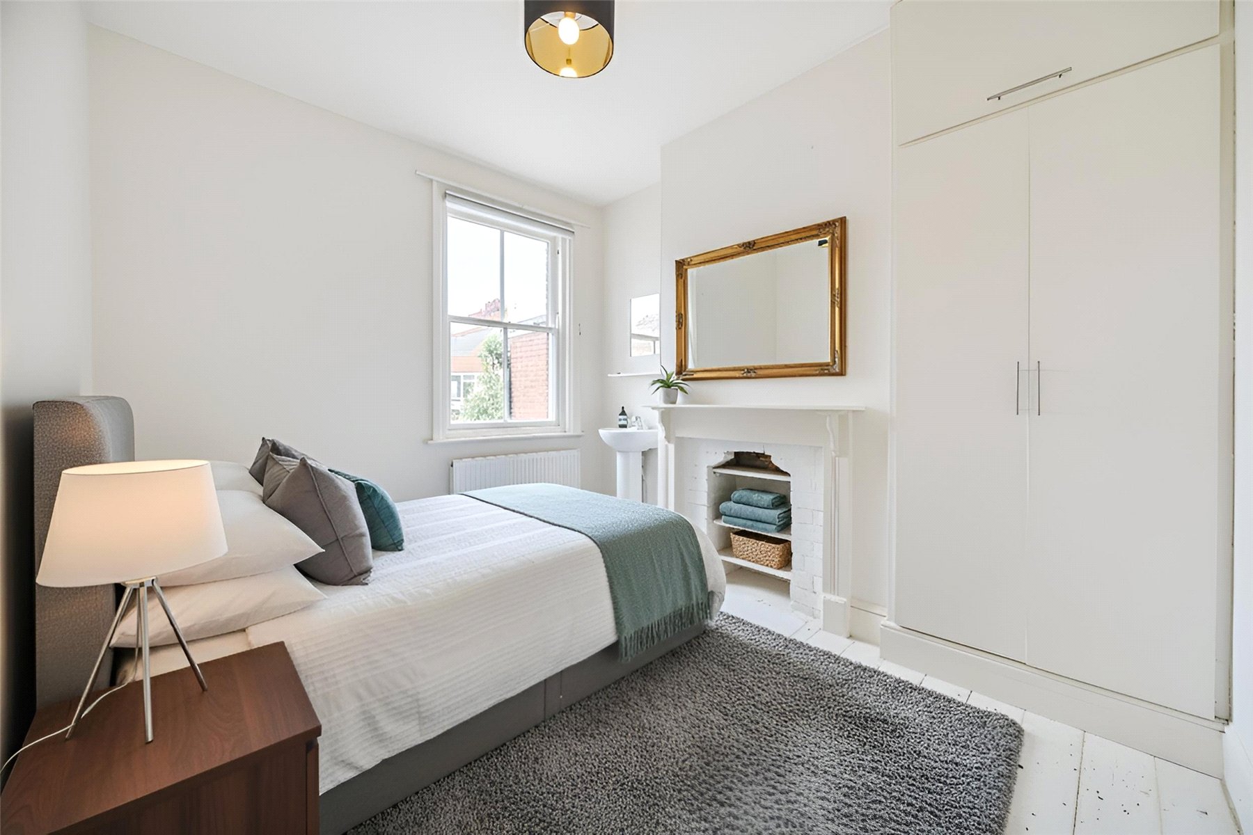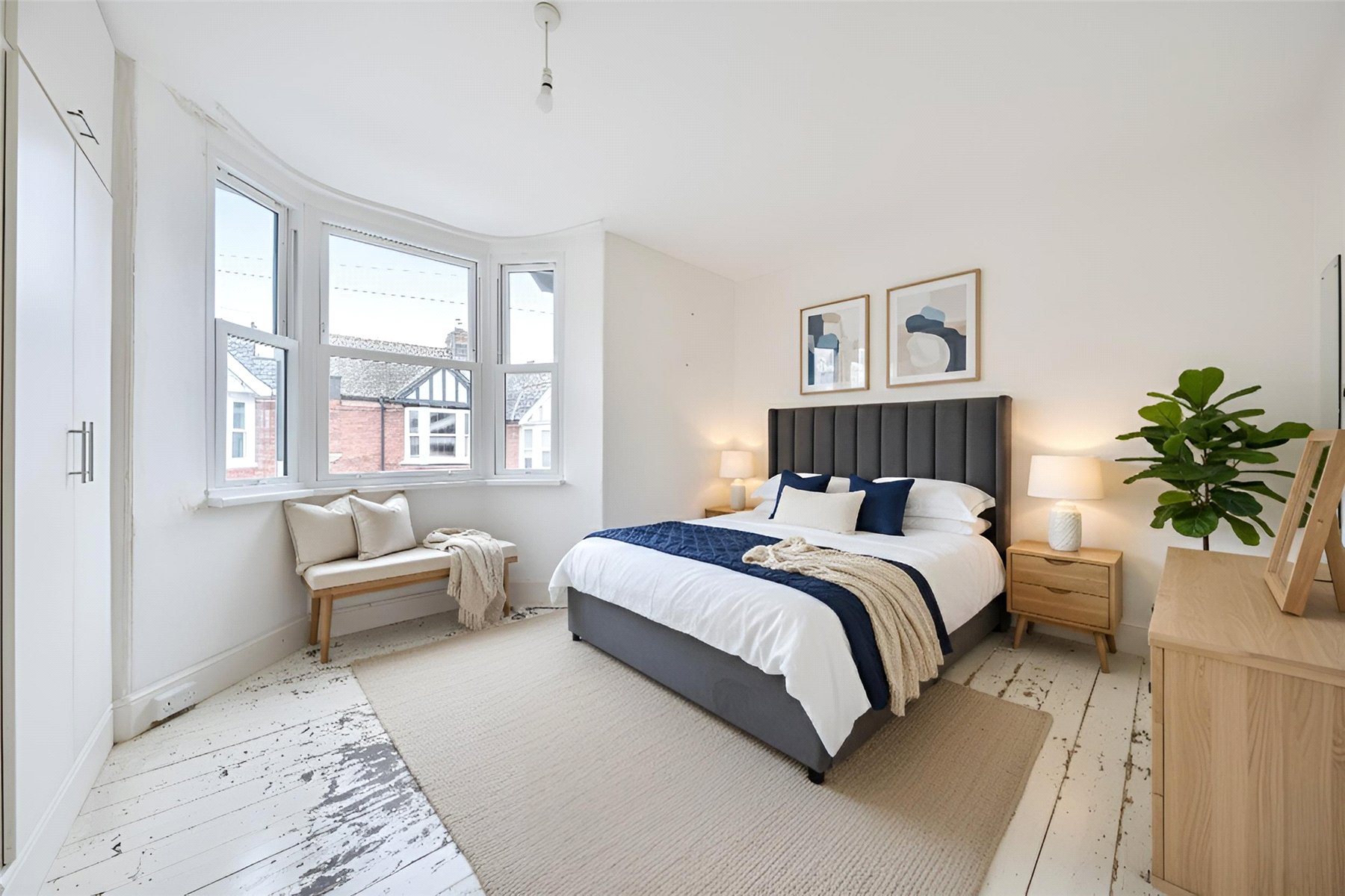 The main first-floor landing leads to two further bedrooms. The principal bedroom is a large double with a front-facing bay window, two sets of fitted double wardrobes with overhead cupboards, exposed floorboards, and a radiator. The second bedroom is another comfortable double with a rear-facing sash window, a fireplace-style recess, pedestal wash hand basin, fitted double wardrobe with overhead cupboard, exposed floorboards, and radiator. Loft storage is accessible from the landing.