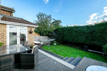 Outside, you'll find a well-maintained garden with grass and area of decking, perfect for enjoying outdoor activities or relaxing in the sunshine, the large hedge keeps the property private without being overlooked. The property also includes a garage and ample parking for multiple cars, providing convenient off-street parking.