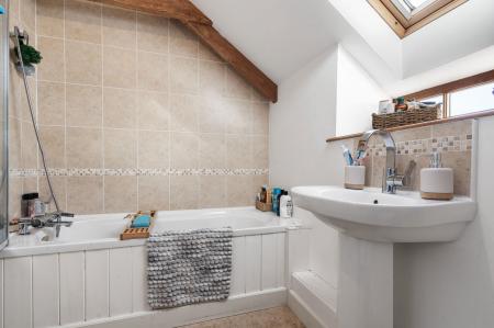 Bath with overhead shower. UPVC double glazed window. Double glazed timber Velux window. Wash hand basin. Electric towel rail. Low flush w.c.