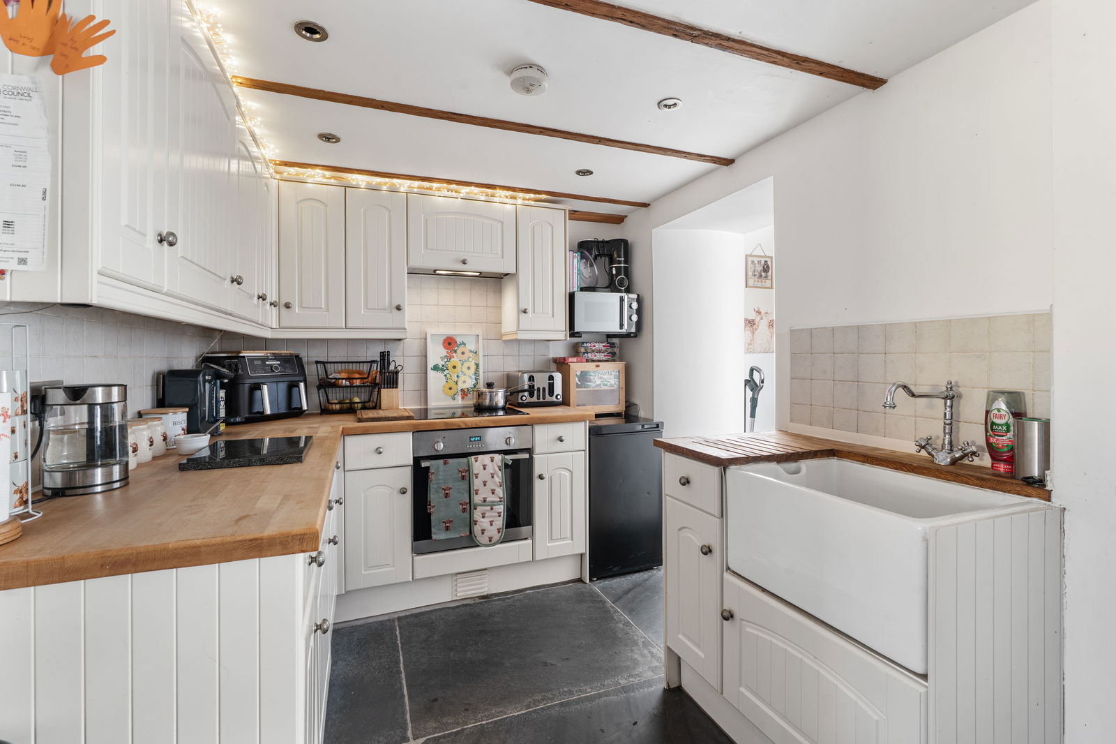 A well presented kitchen with 4 ring electric hob, oven and grill, sink with stainless steel tap, base and wall cupboards and slate flooring.