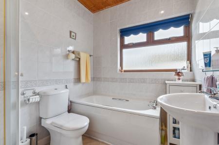 Well presented bathroom suite comprising wash hand basin, bath, low flush w.c. and corner shower cubicle. UPVC double glazed window and radiator.