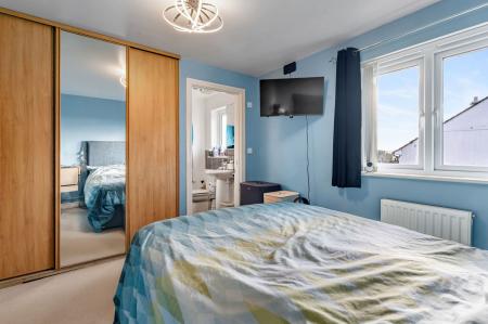 A modern fitted en-suite with shower enclosure with rainfall shower head above. Low level w.c. Wash hand basin with tiled splashback. Heated towel rail. Opaque UPVC double glazed window to front.