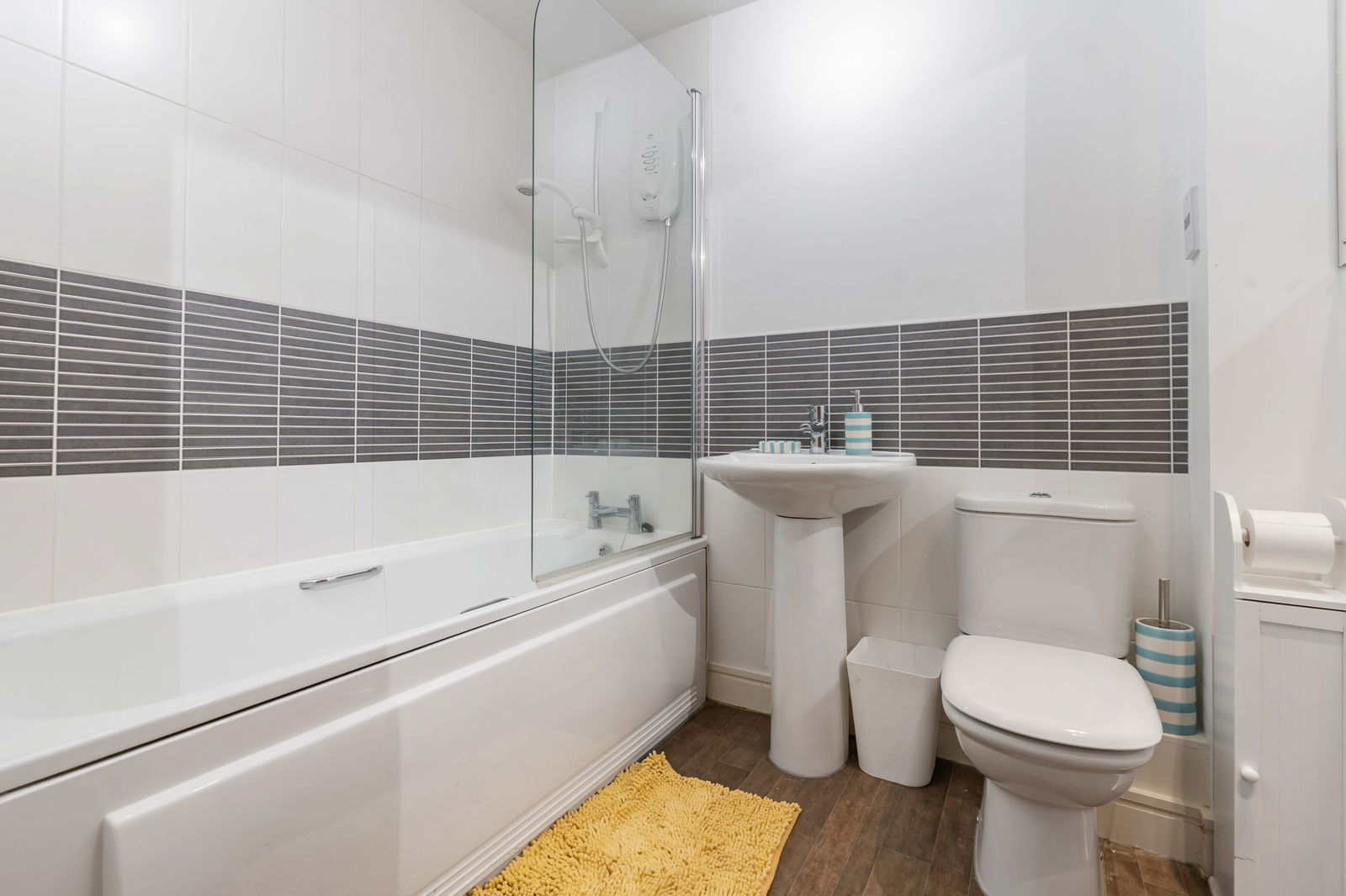 Modern fitted bathroom suite with panelled bath with shower over and tiled surround. Low level w.c. Wash hand basin with tiled splashback. Radiator.