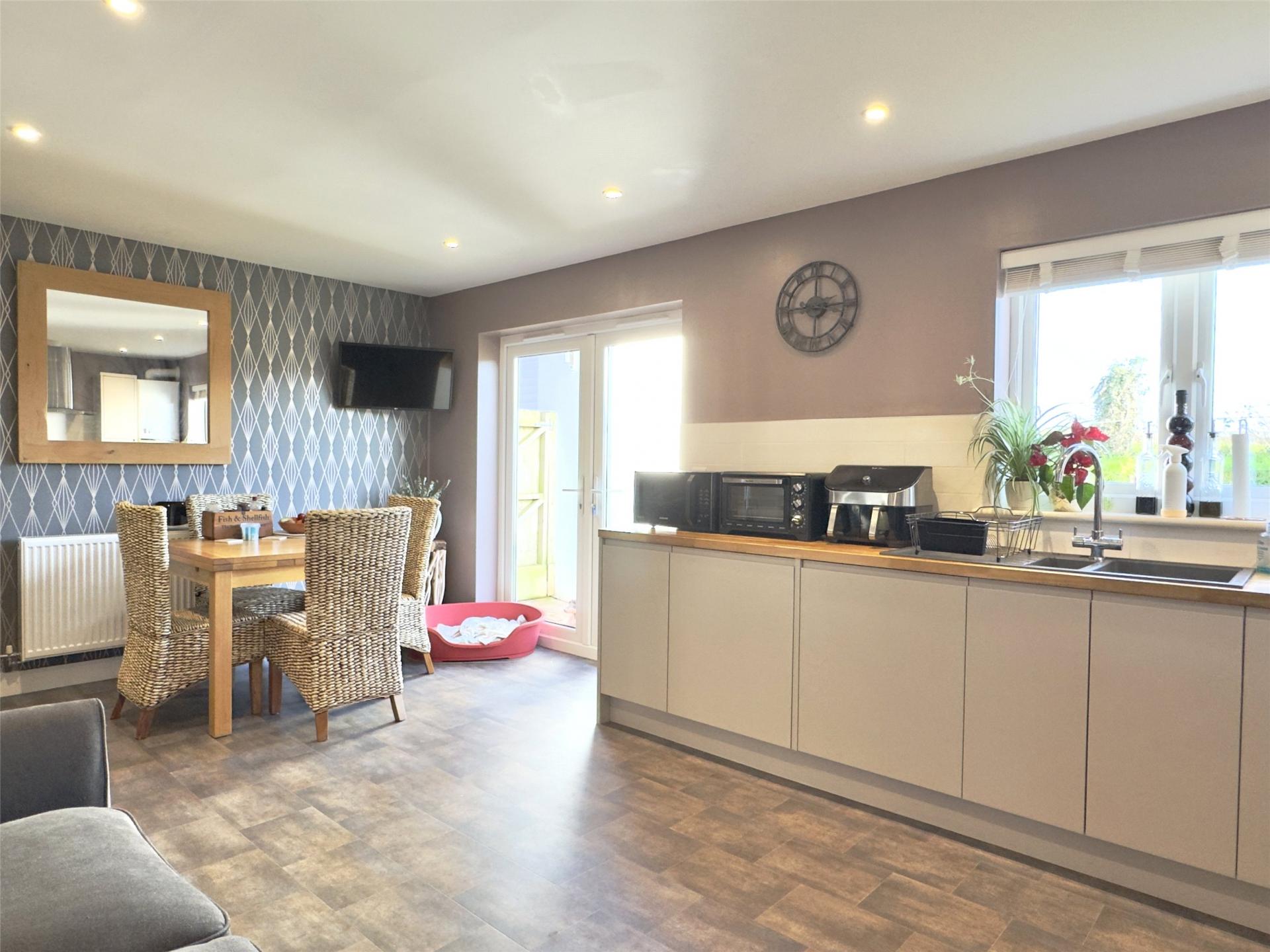 A standout feature of the property is the spacious kitchen/dining room, which is well-equipped with an integrated electric oven, hob, dishwasher, fridge/freezer, and washing machine. The dining area provides a lovely family space and opens directly onto the private rear garden through French doors, making it ideal for indoor-outdoor living.