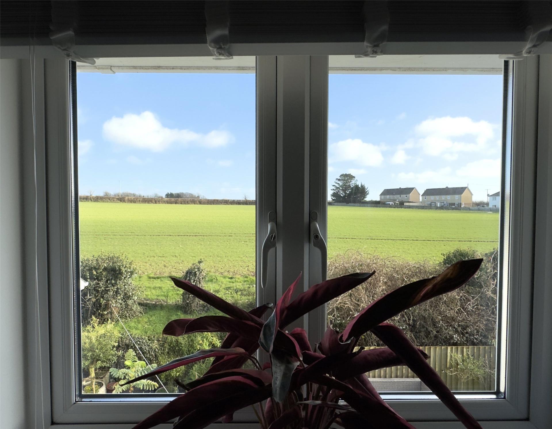 Upstairs, the main bedroom enjoys rural views, a built-in wardrobe, and an en-suite with a shower cubicle, pedestal basin, and heated towel rail. The second bedroom also benefits from countryside views and storage space, while the third bedroom, another double, offers a similar outlook. The family bathroom is fully tiled and includes a panelled bath with a shower over, a vanity unit with storage, a concealed cistern WC, and a heated towel rail.