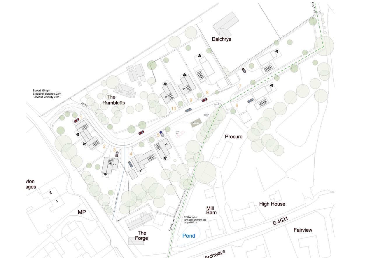 The Hambletts is a proposed exclusive development of ten impressive market homes. There would be two 2-bedroom link detached houses (each circa 103 square metres), one 3-bedroom detached bungalow (circa 116 square metres), four 3-bedroom detached houses (each circa 126 square metres), and three 4-bedroom homes (ranging from circa 210-219 square metres).
