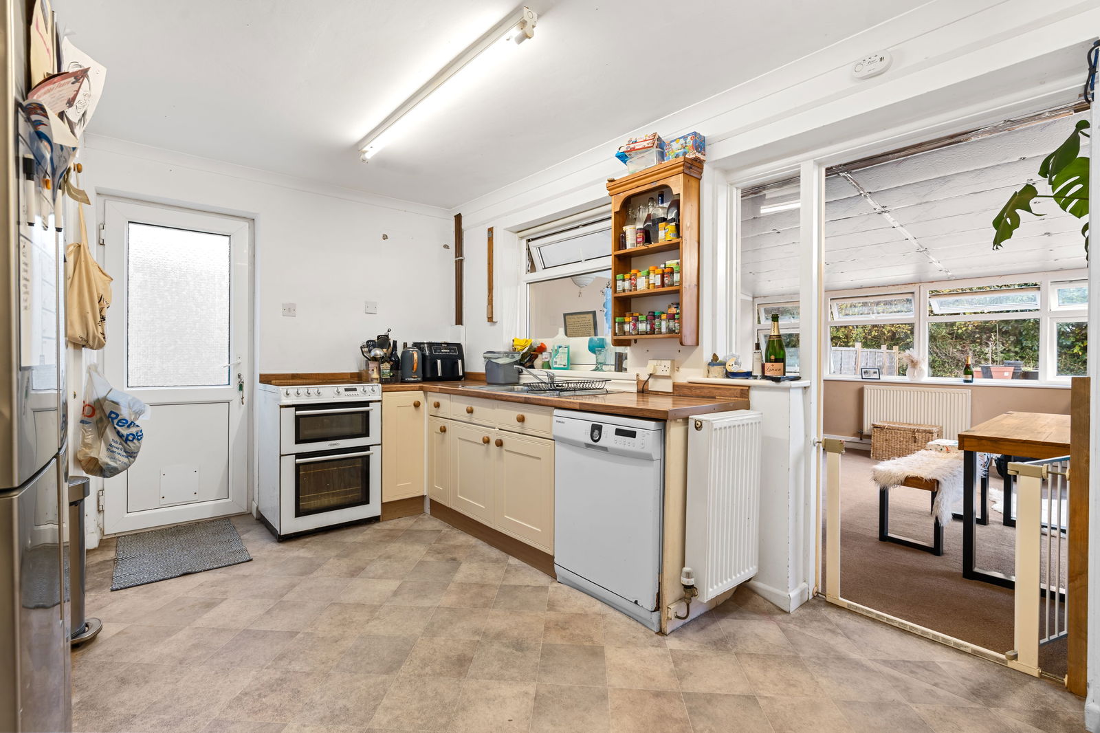 Good range of wall and base cupboards with worktops over and drawers, space, power and plumbing for American style fridge/freezer, built-in storage cupboards, space and power for cooker, one and a half bowl stainless steel sink with mixer tap over, UPVC double glazed window looking into conservatory, radiator.