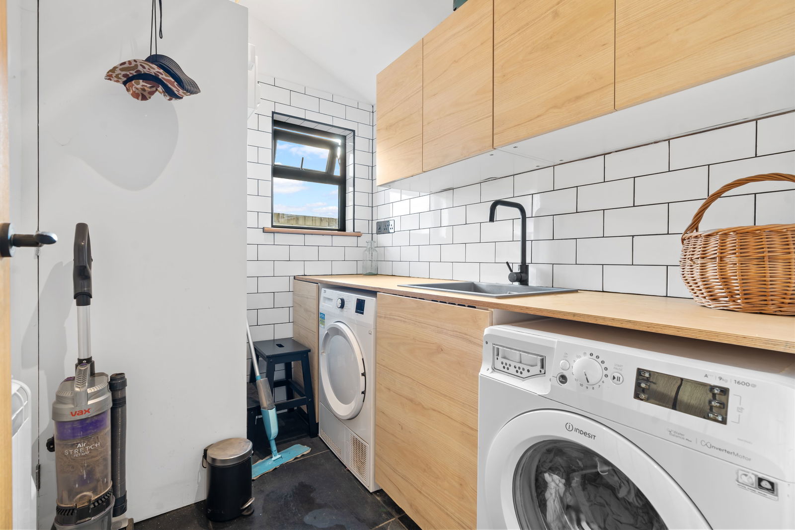 Modern fitted utility room with good range of wall and base cupboards with worktops over, sink with mixer tap, UPVC double glazed window to side, space and plumbing for washing machine, space and power for tumble dryer, slate flooring. Modern electric wall heater and immersion tank.