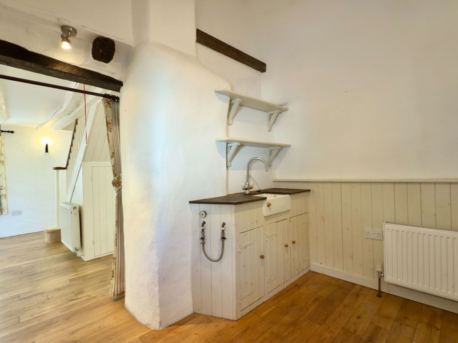 Half glazed stable door to garden. Sink unit and mixer tap with worktops to each side and cupboard below. Part Wainscott panelling. Radiator.