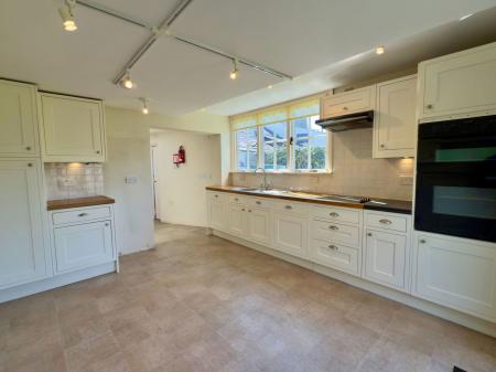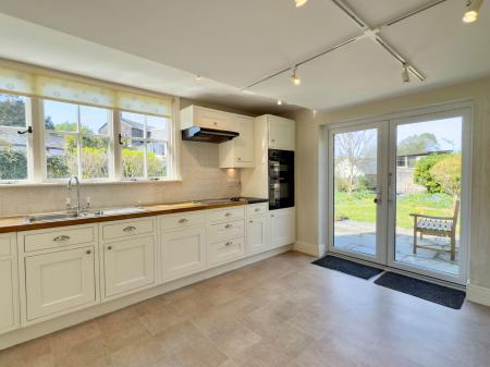 A light dual aspect room with double glazed window to side and double glazed French doors in UVPC frames opening to the garden. The kitchen is fitted with a range of modern units comprising base cupboards with worktops over and wall cupboards above. Integral electric oven and grill together with 4 ring hob. One and a half bowl stainless steel sink unit and mixer tap. Integral fridge and dishwasher. Radiator. Telephone point.