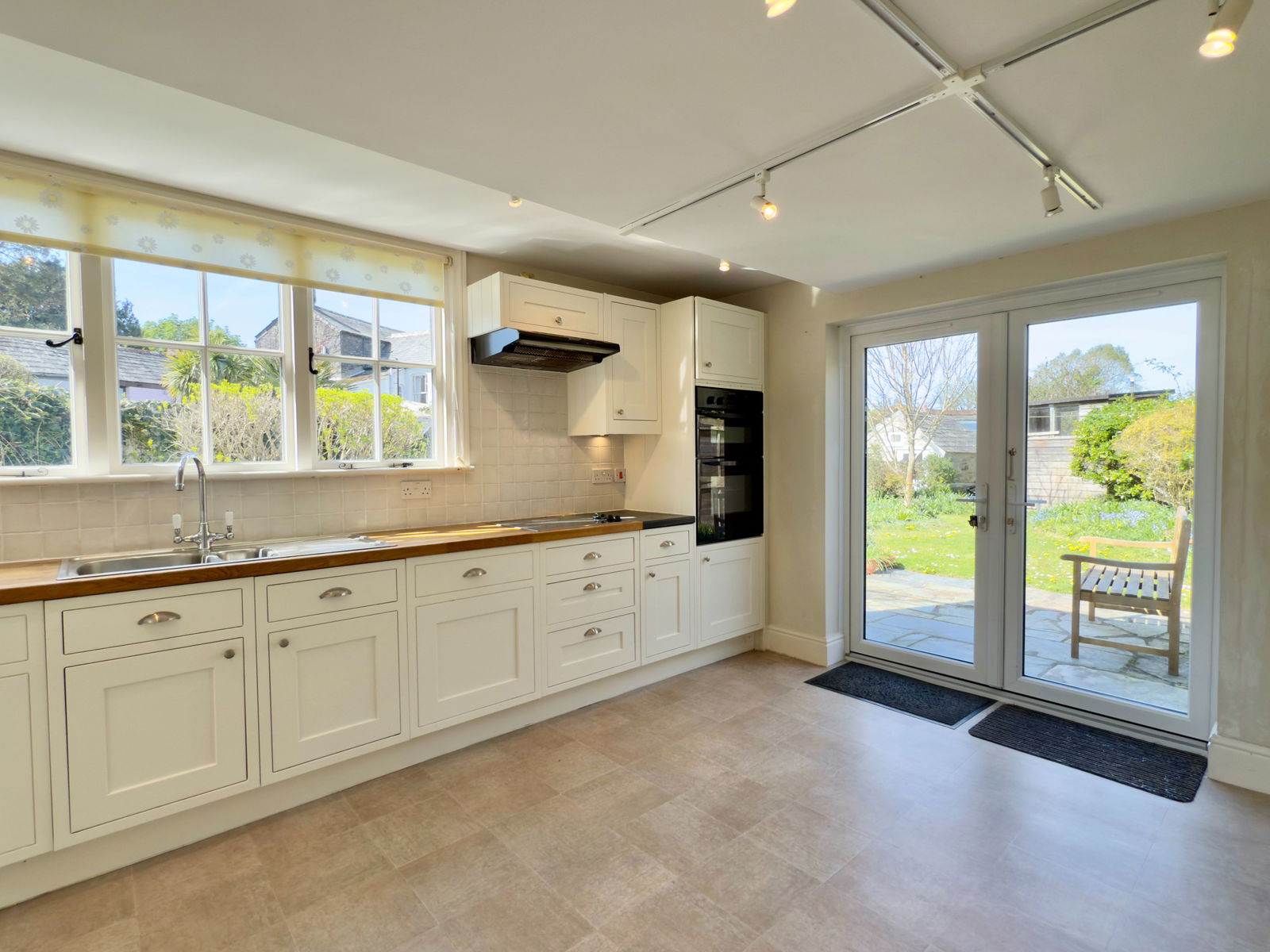Skylight and opaque pattern window to side together with glazed door to side porch. Stainless steel sink unit and double drainer. Space and plumbing for automatic washing machine and space and power for tumble dryer.