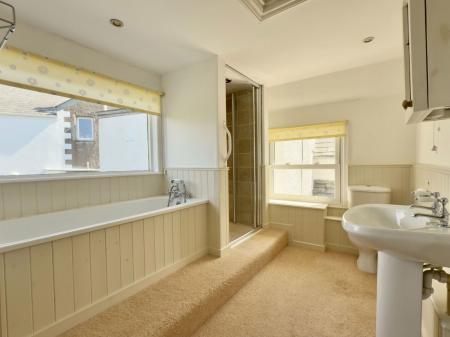 Panelled bath and separate shower cubicle together with low flush w.c. and pedestal wash hand basin. Heated towel rail. Wall mounted electric fan heater. Wainscott panelling. Double glazed window to rear and UPVC double glazed sash window to side.