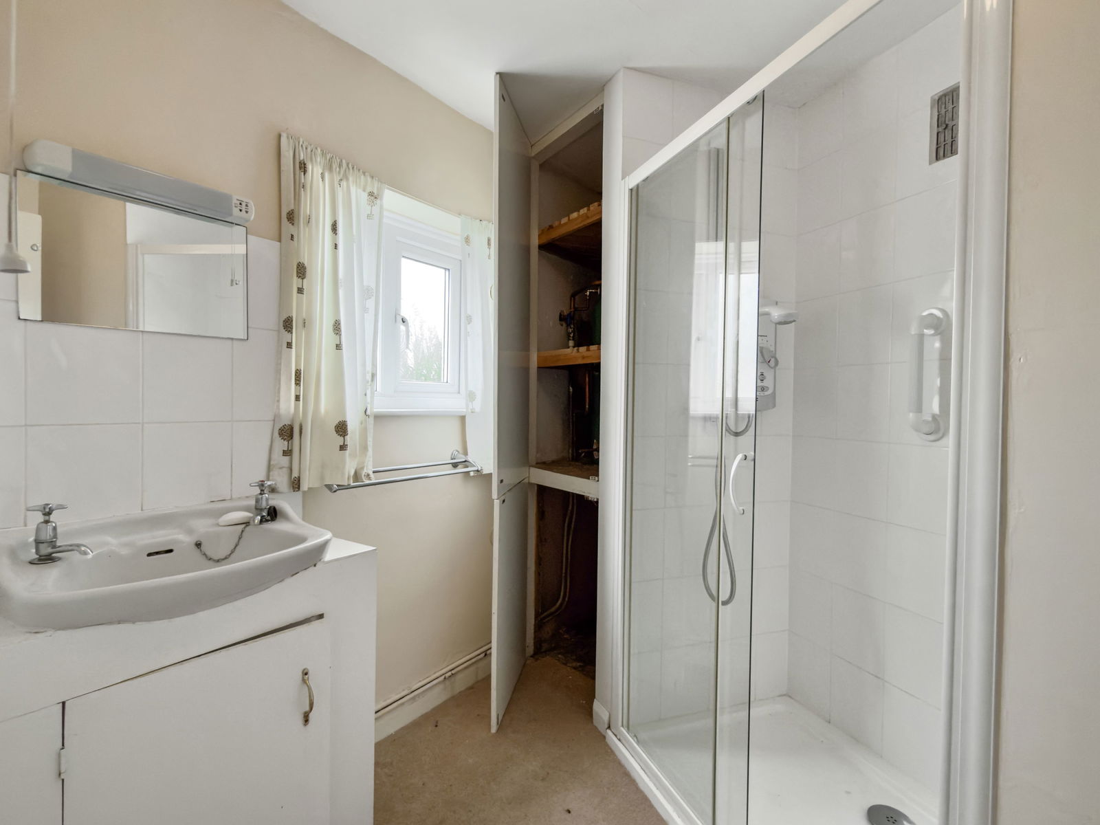 Walk-in shower cubicle with electric shower, airing cupboard housing hot water tank and wash hand basin with vanity storage cupboard below, wall mounted fan heater, opaque UPVC double glazed window to rear.