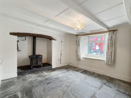 UPVC double glazed window to front, original slate flooring, fireplace with woodburning stove and cloam oven, modern electric wall mounted heater, understairs storage cupboard.