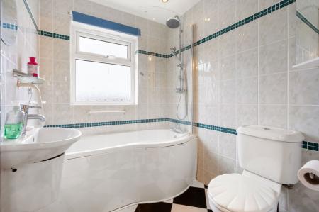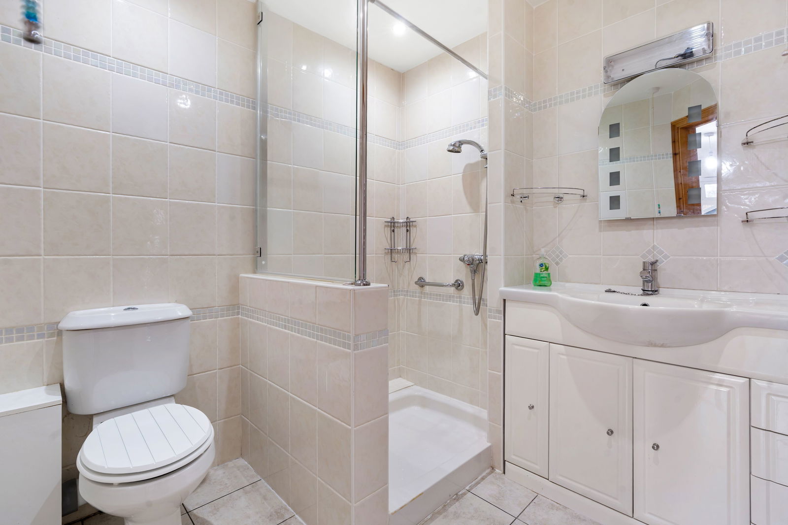 Immaculate en suite with large shower, low flush W.C., wash hand basin with built-in storage below, Creda electric heater and stainless steel towel rail, extractor fan.