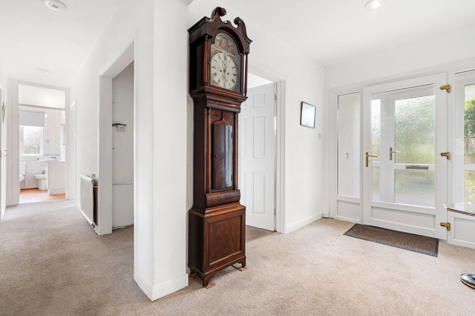 2 radiators, stairs off to first floor, cloaks hanging recess, 2 deep built-in shelved cupboards plus deep built-in understairs cupboard.
