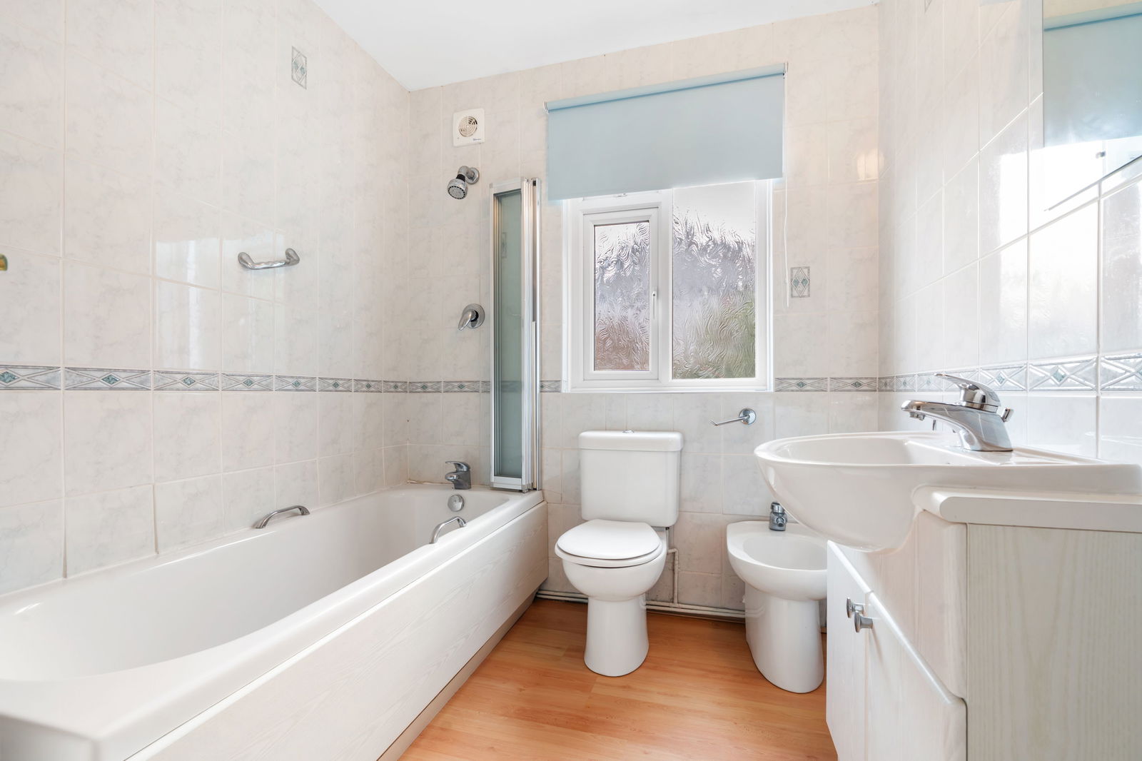 With large shower enclosure, Mira thermostatic shower, low level W.C., wash hand basin, bidet, tiled splashback, radiator, double glazed skylight to rear.