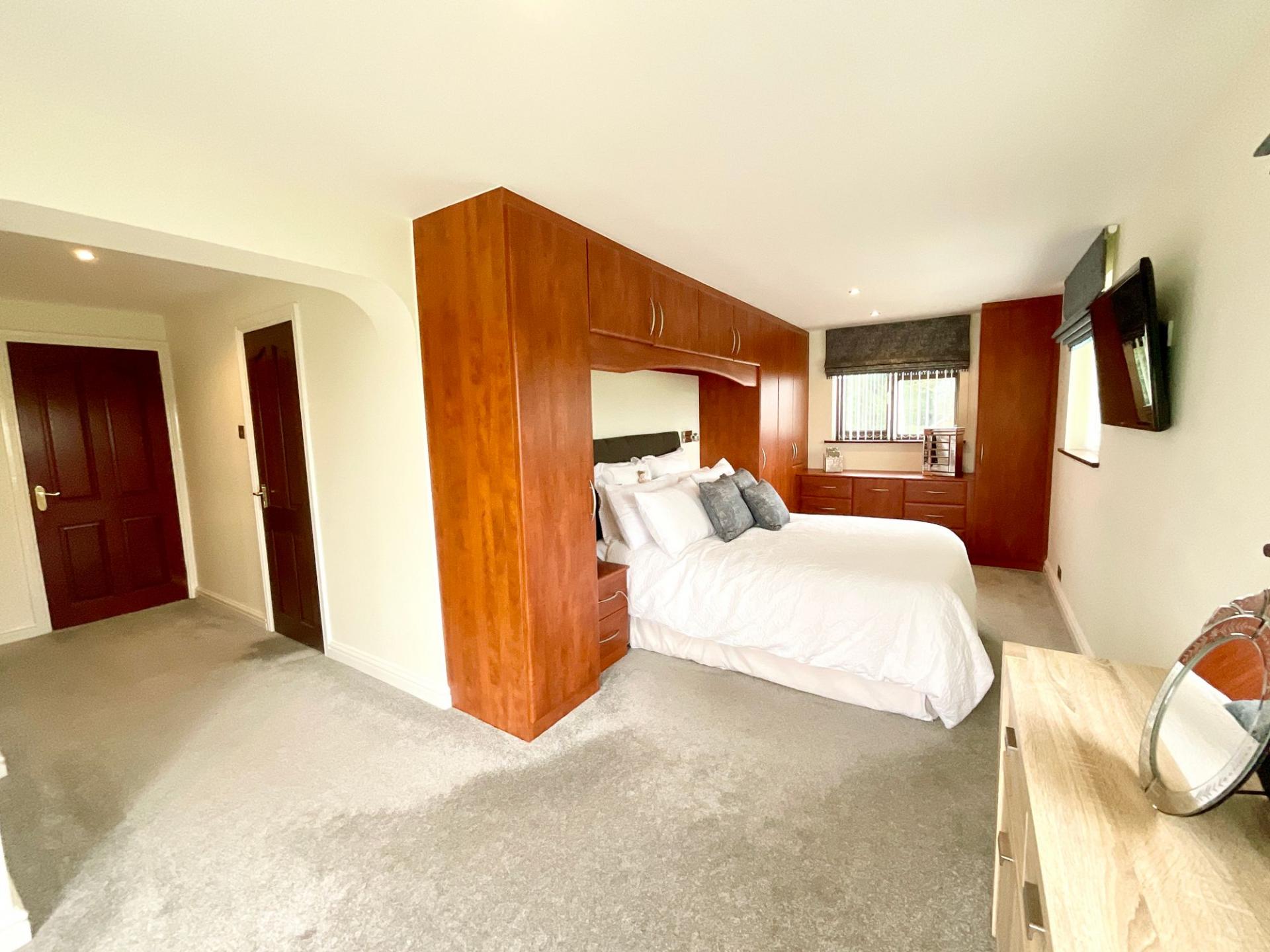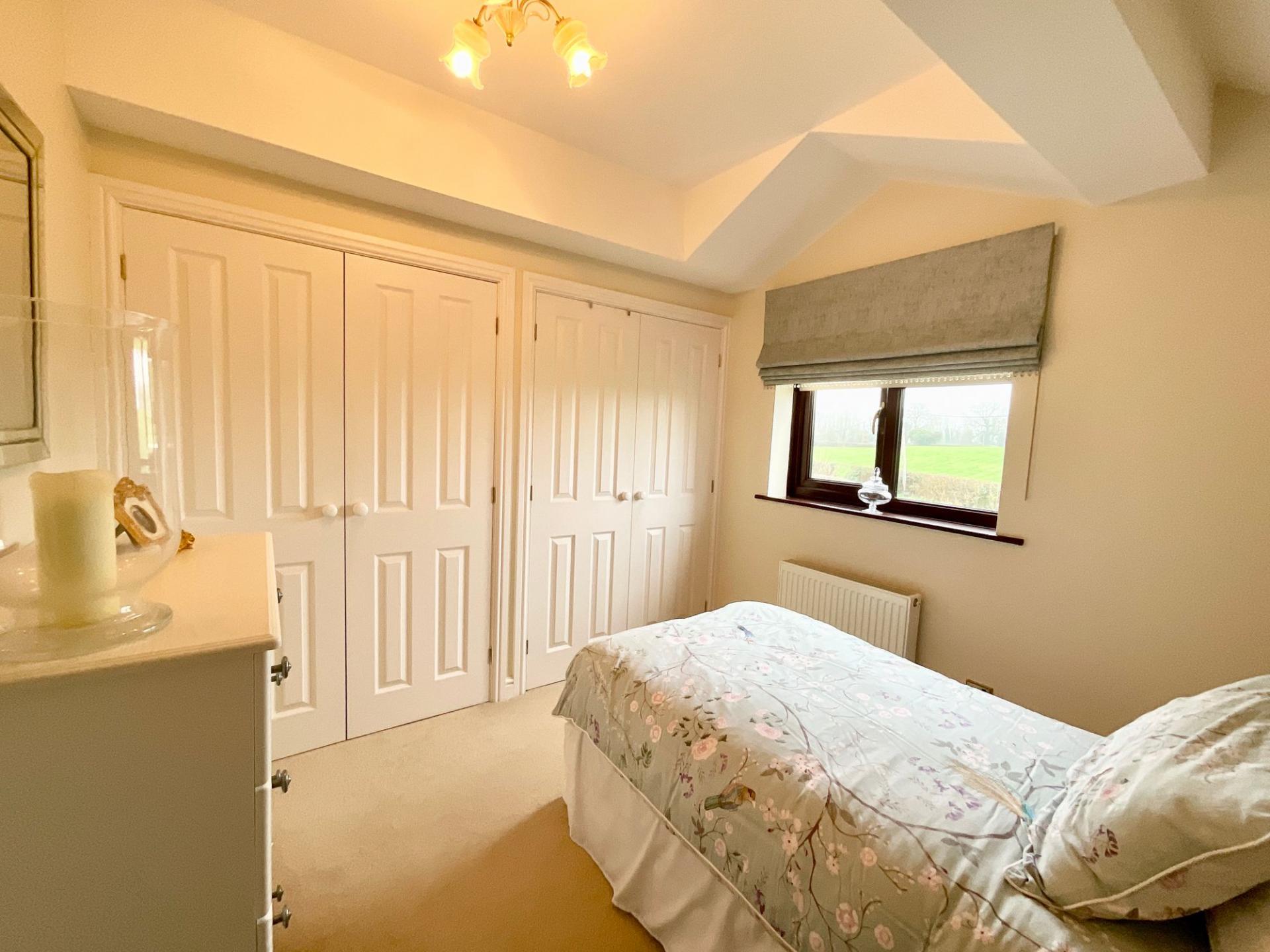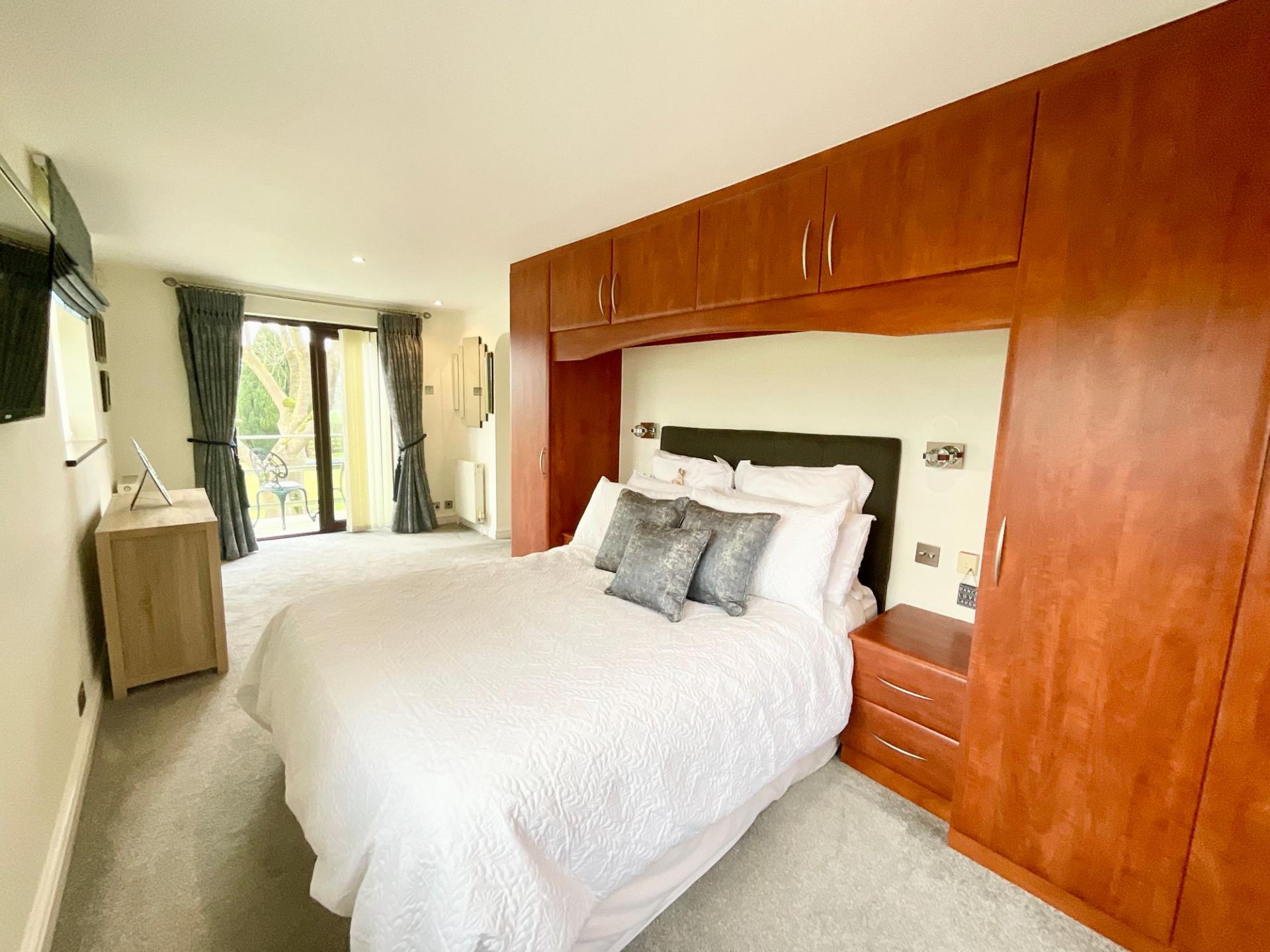 - Impressive principal bedroom with en-suite, fitted furniture and private balcony overlooking the garden and surrounding fields.