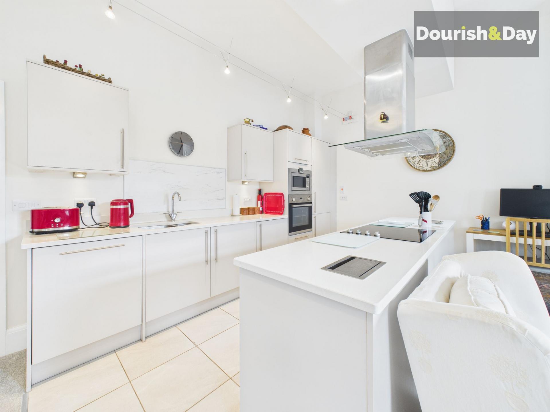 The building itself benefits from secure intercom entry. Inside, the apartment comprises a welcoming entrance hallway, a light and spacious open-plan lounge, and a contemporary fitted dining kitchen complete with granite work surfaces, a breakfast island, and a range of modern integrated appliances. The accommodation includes two double bedrooms, with the main bedroom featuring fitted wardrobes and an ensuite shower room, alongside a contemporary main bathroom. The lounge and both bedrooms enjoy large south-facing, double-glazed Georgian-style sash windows, flooding the rooms with natural light.