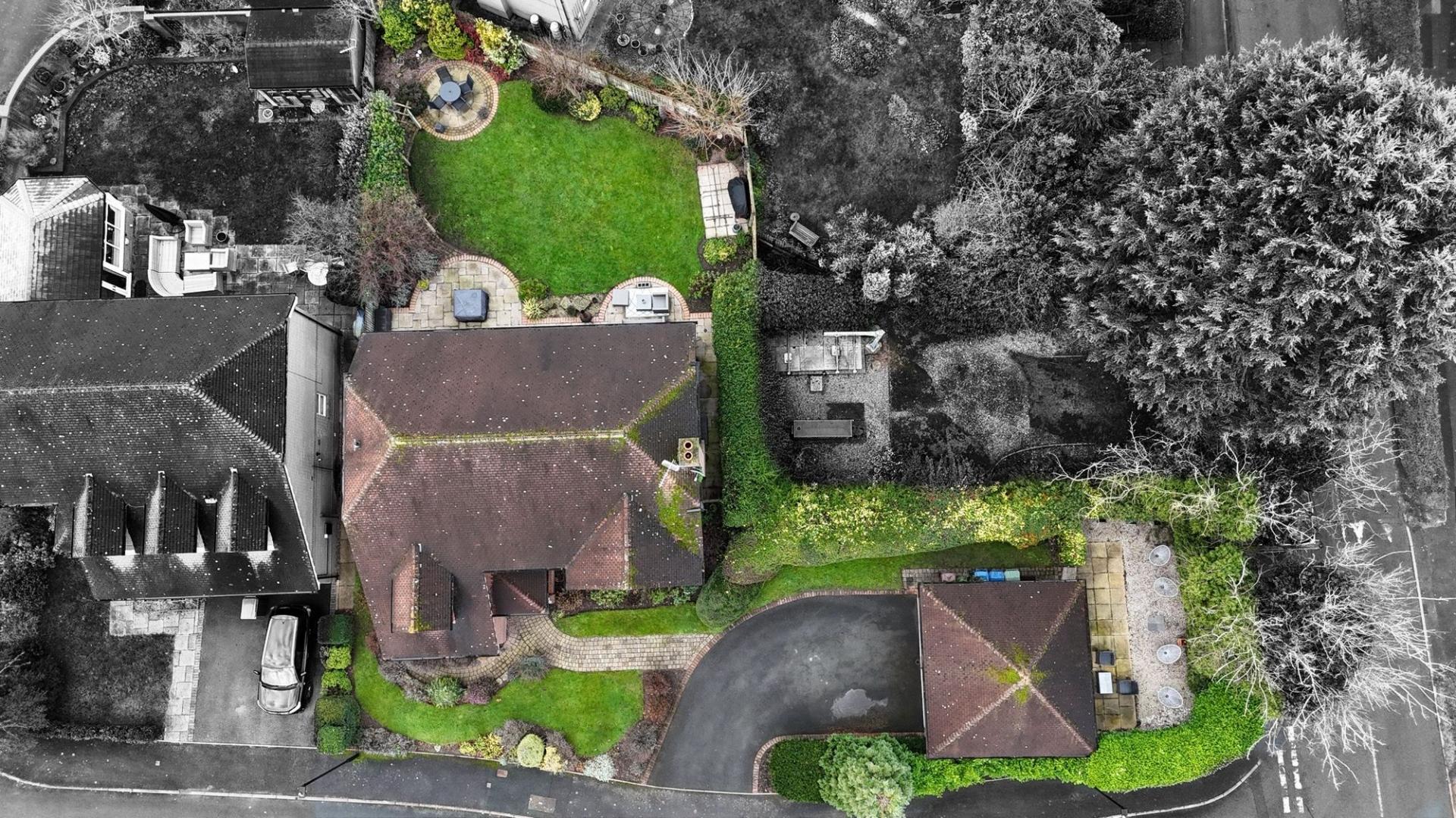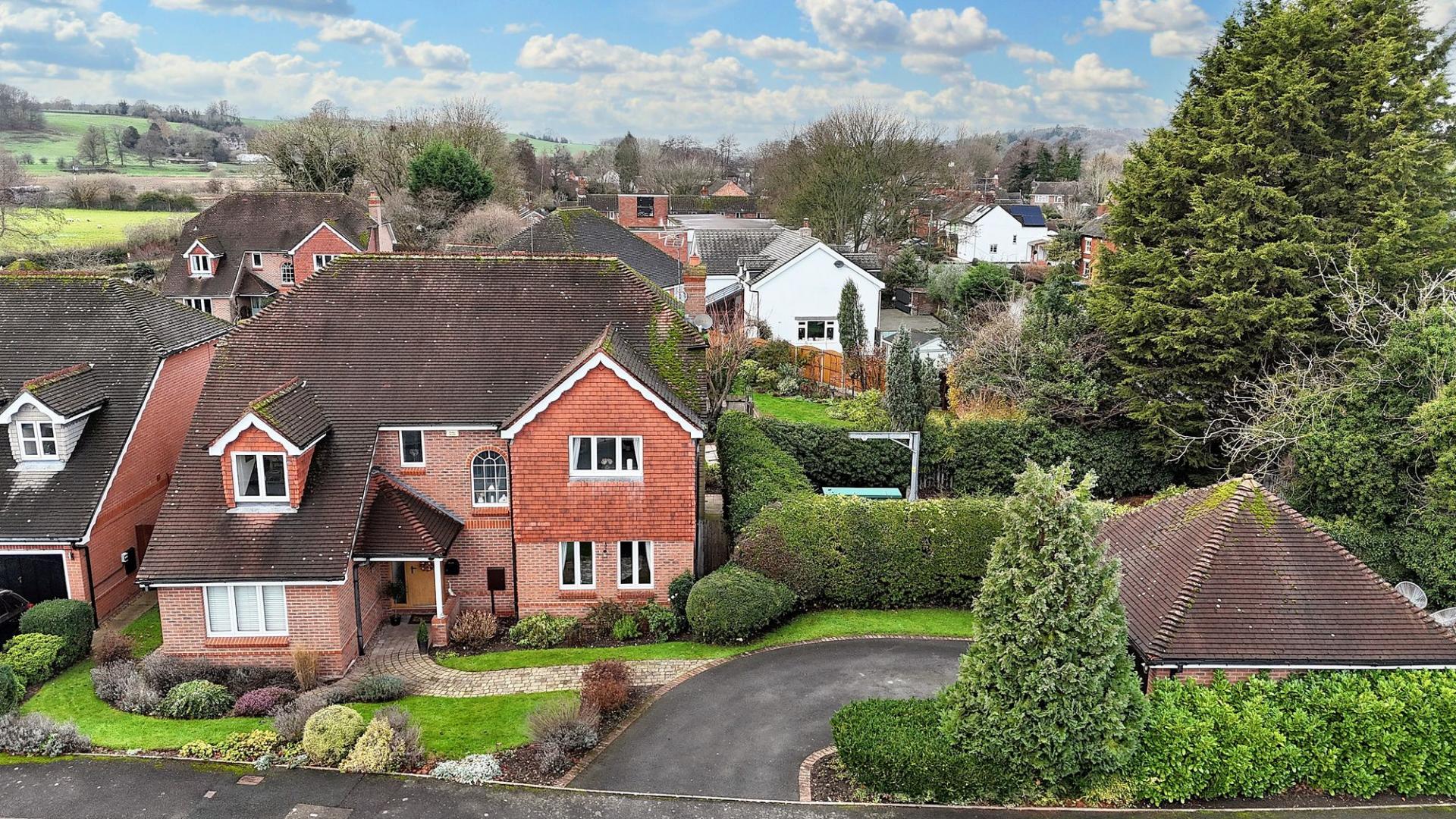 - To the front, well-manicured gardens with shrubbery and grass lawn, a driveway with off-road parking, and a detached double garage with its own hidden garden space.