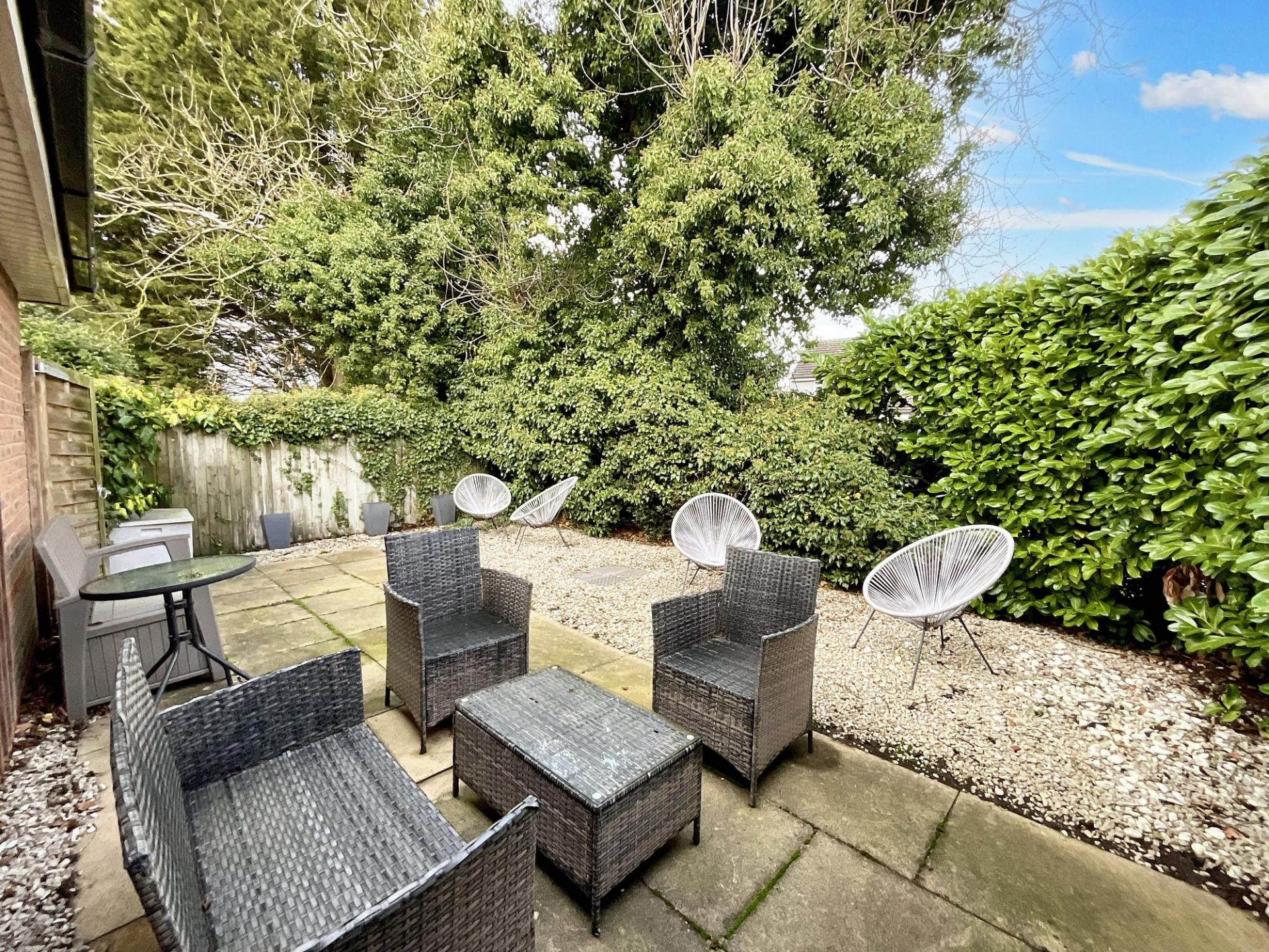 - Beautifully presented rear garden with a large Indian-stone patio with block paved borders, a lush grass lawn, and mature greenery throughout.