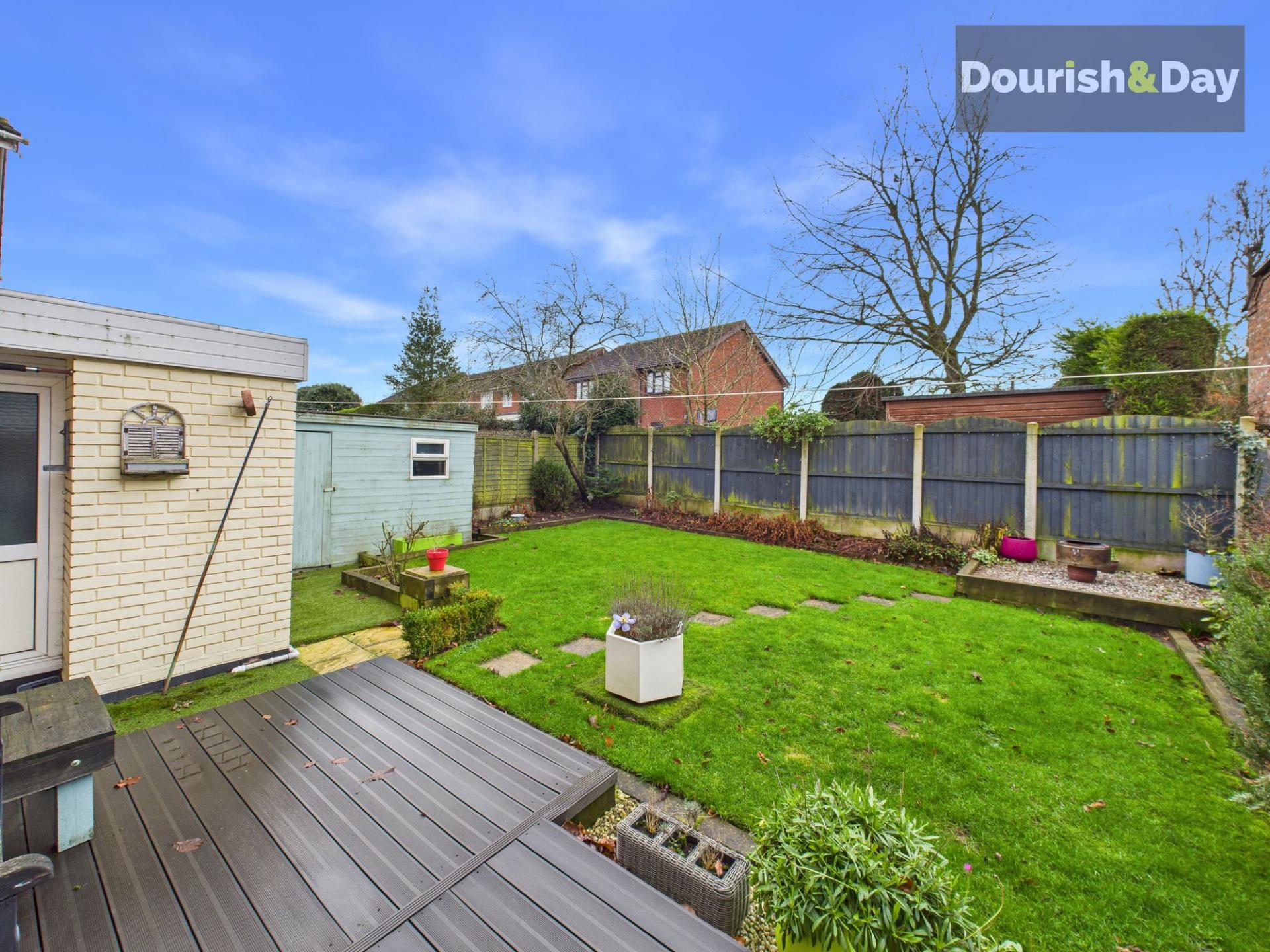 Outside, the garden has been carefully arranged to create distinct zones. A decked seating area leads onto a lawn bordered by sleeper built raised beds, which continue around the rear and side of the garden. To one side, an area of astroturf and paving sits neatly beside the garage, separated from the lawn by sleepers, while a pebbled section to the rear adds another low maintenance feature. The garden enjoys a good level of privacy and includes gated side access leading back to the front of the property.