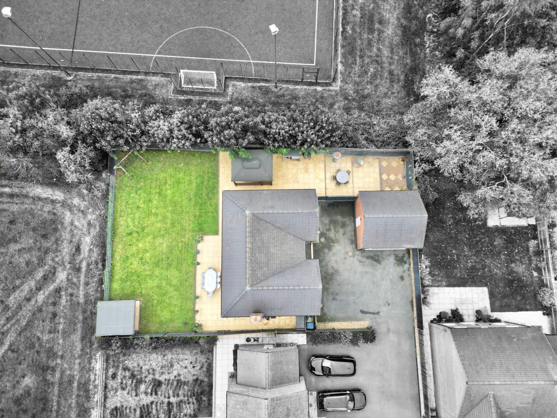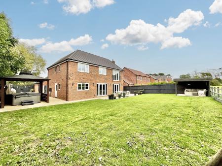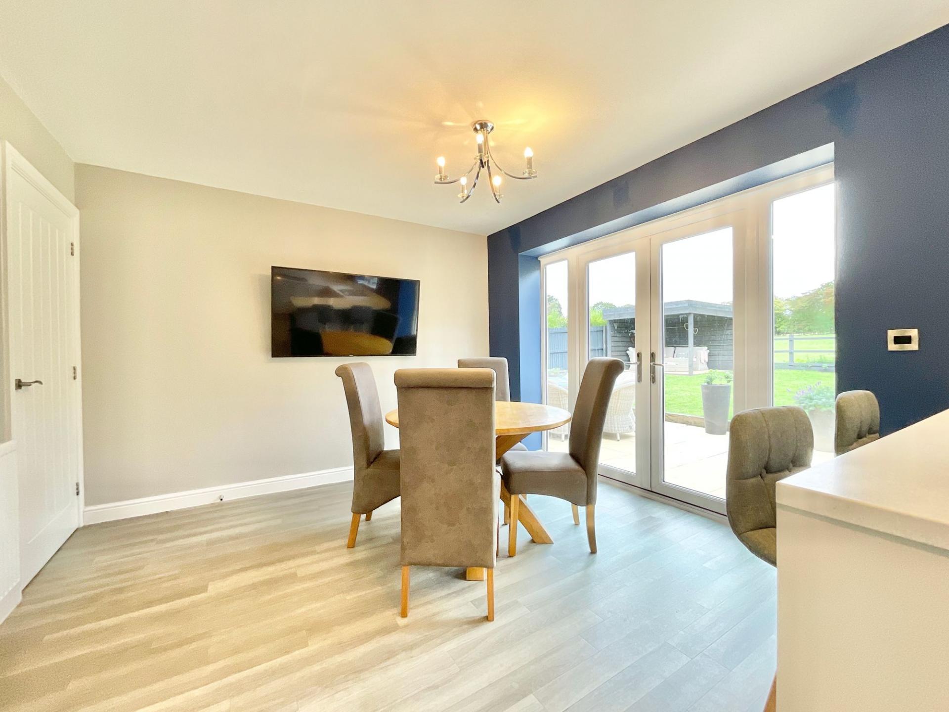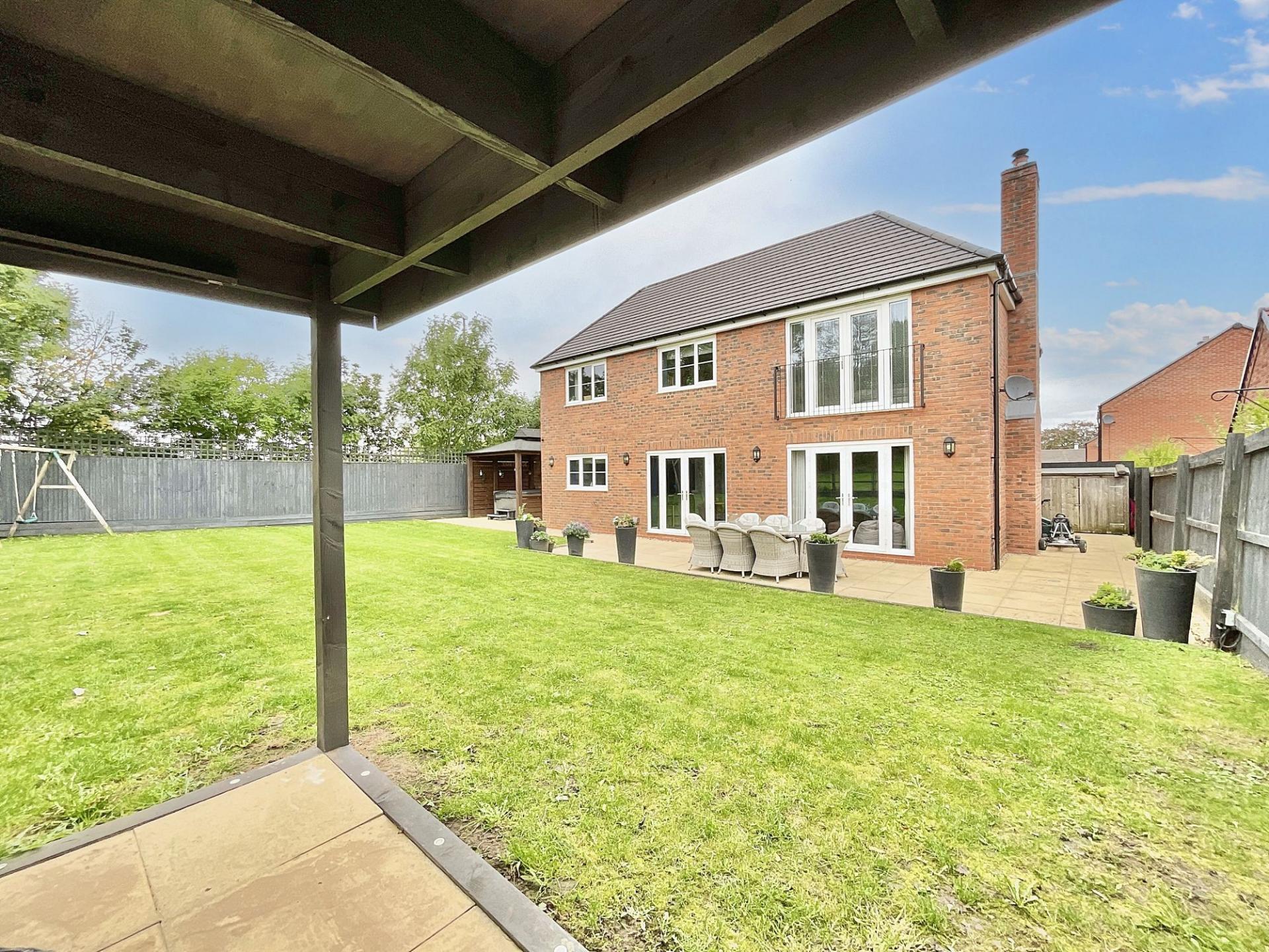 - Outside, enjoy a generous rear garden within the extended corner plot, showcasing multiple entertainment and seating areas, laid lawn and field views.