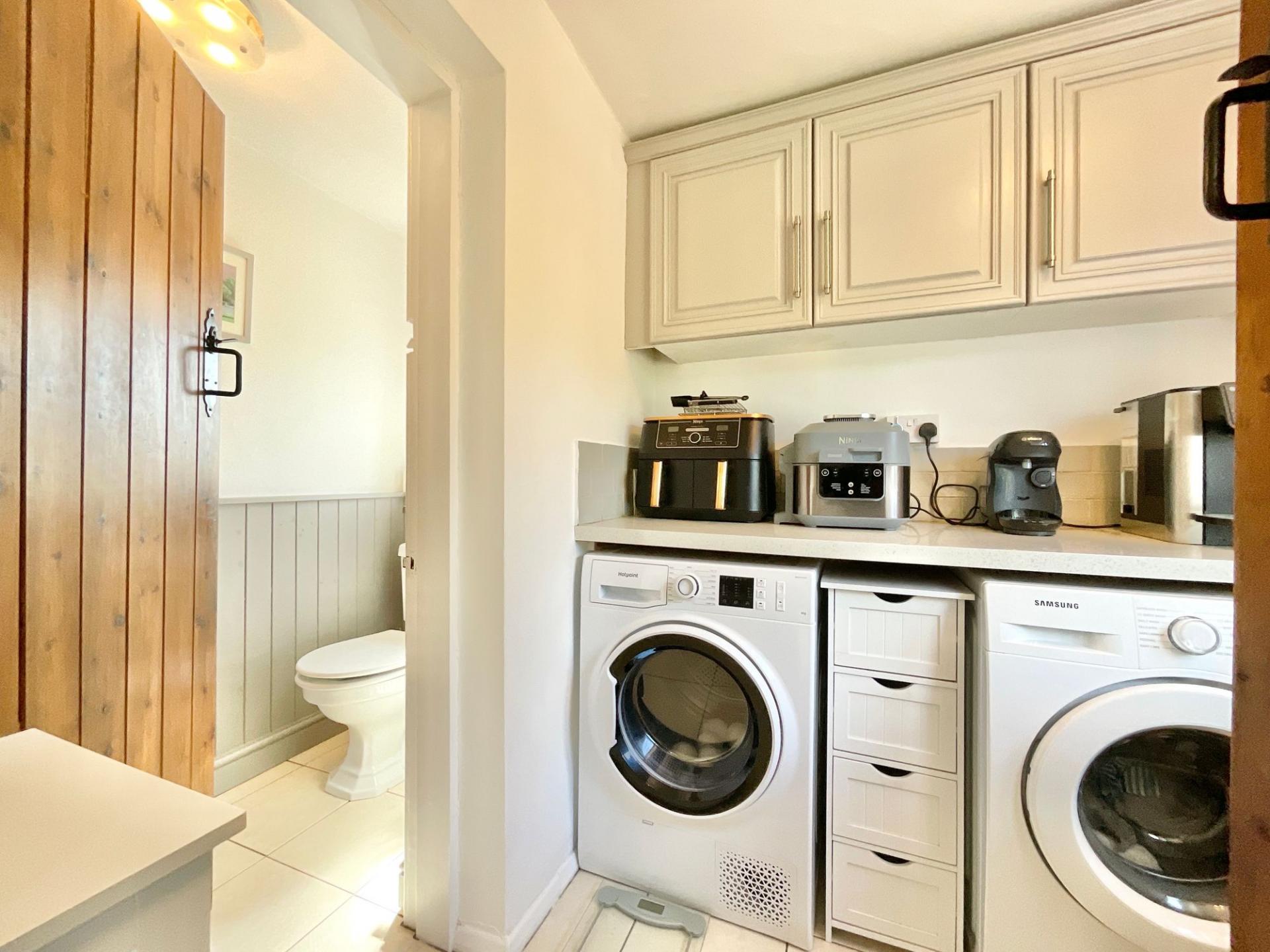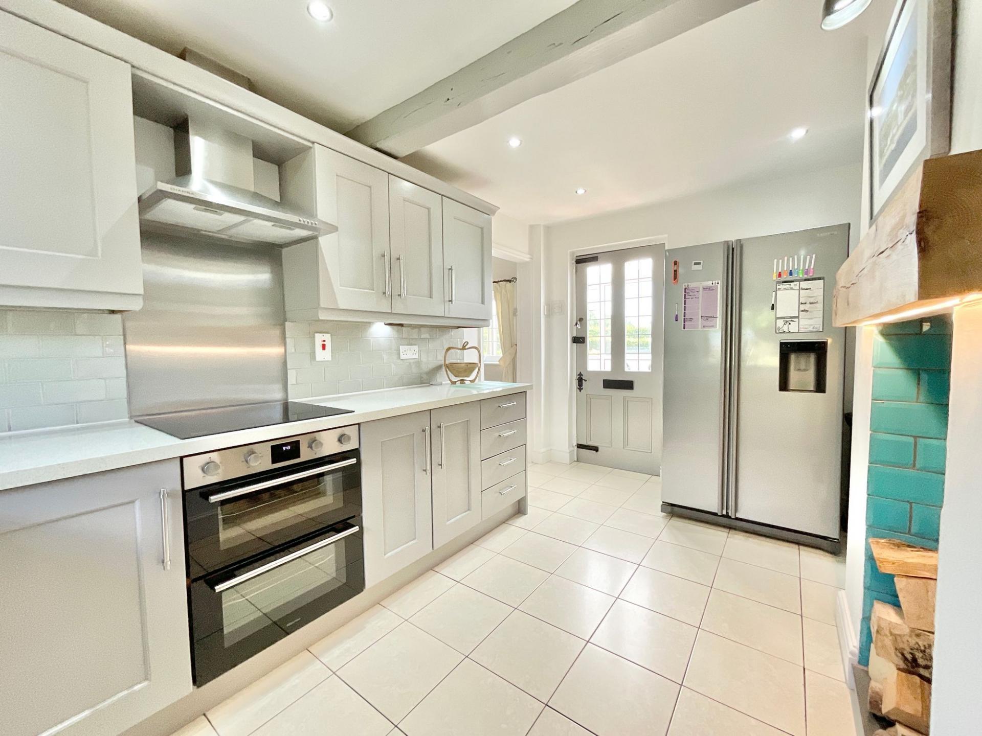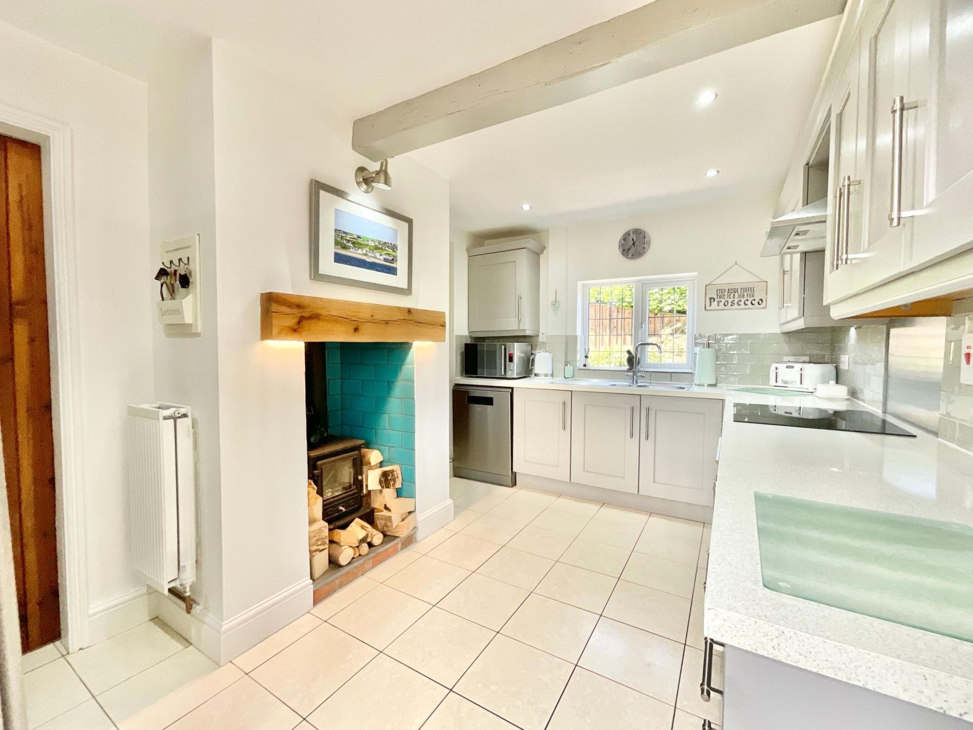 - With a modern kitchen fitted with matching base and eye level units and worktops, there is also a log burner