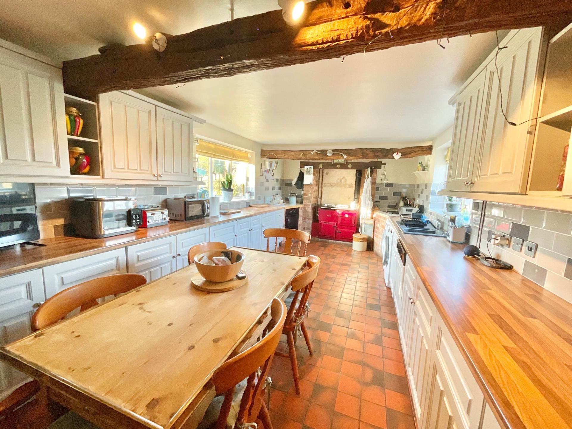 - Large farmhouse-style kitchen with extensive worktops and a traditional Rayburn, opening to an L-shaped living and dining room with log burner, perfect for cosy evenings or lively family gathering...