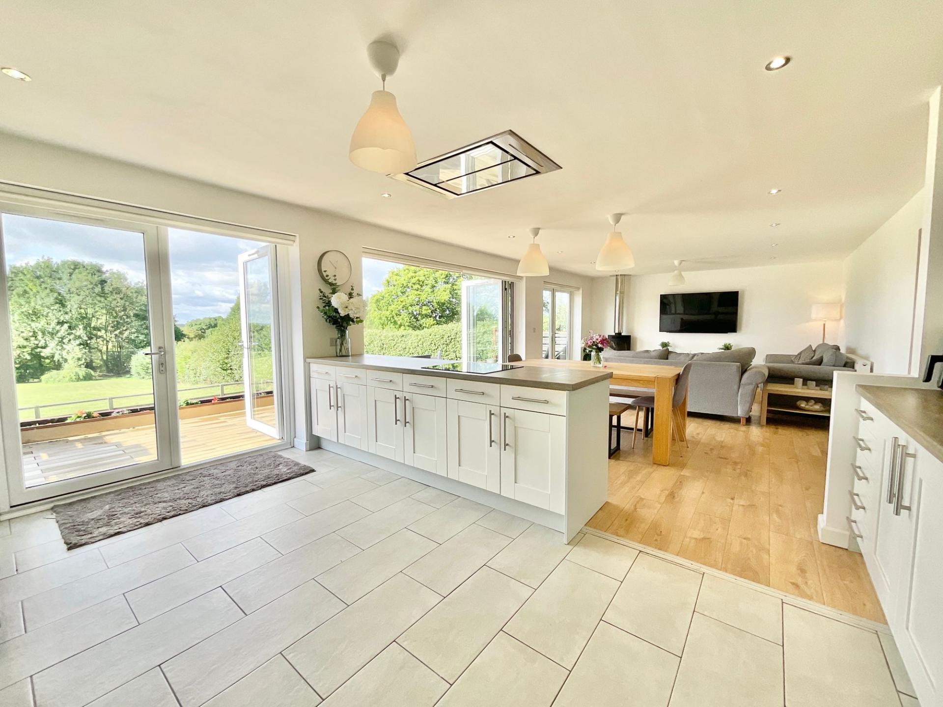 - An open plan kitchen/diner/living room is the heart of the home, featuring dual French doors and Bifolds for direct garden access and scenic views.