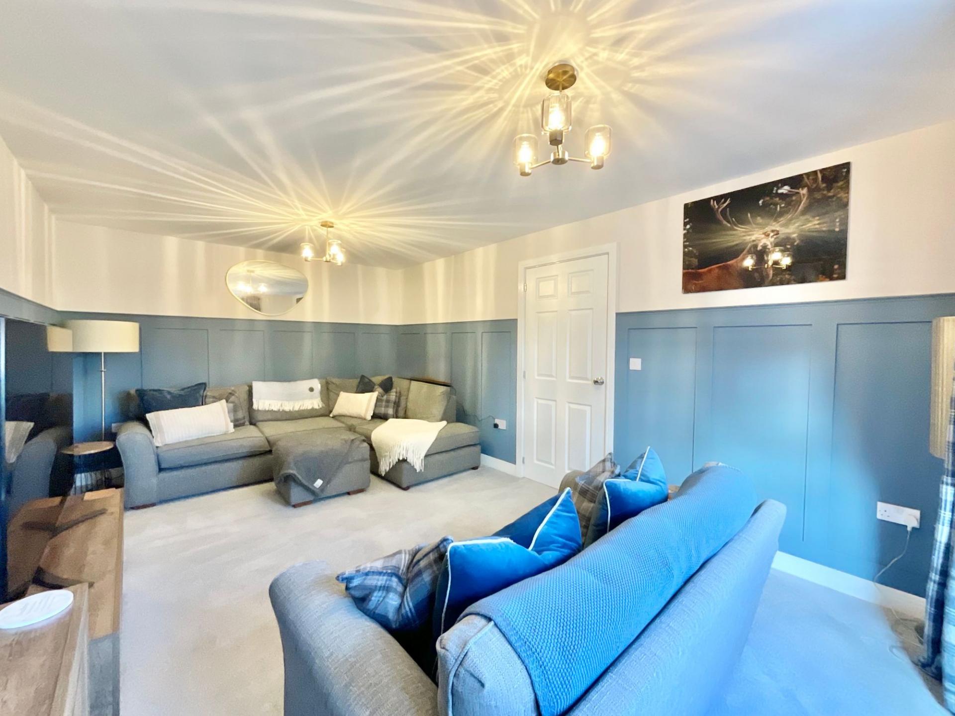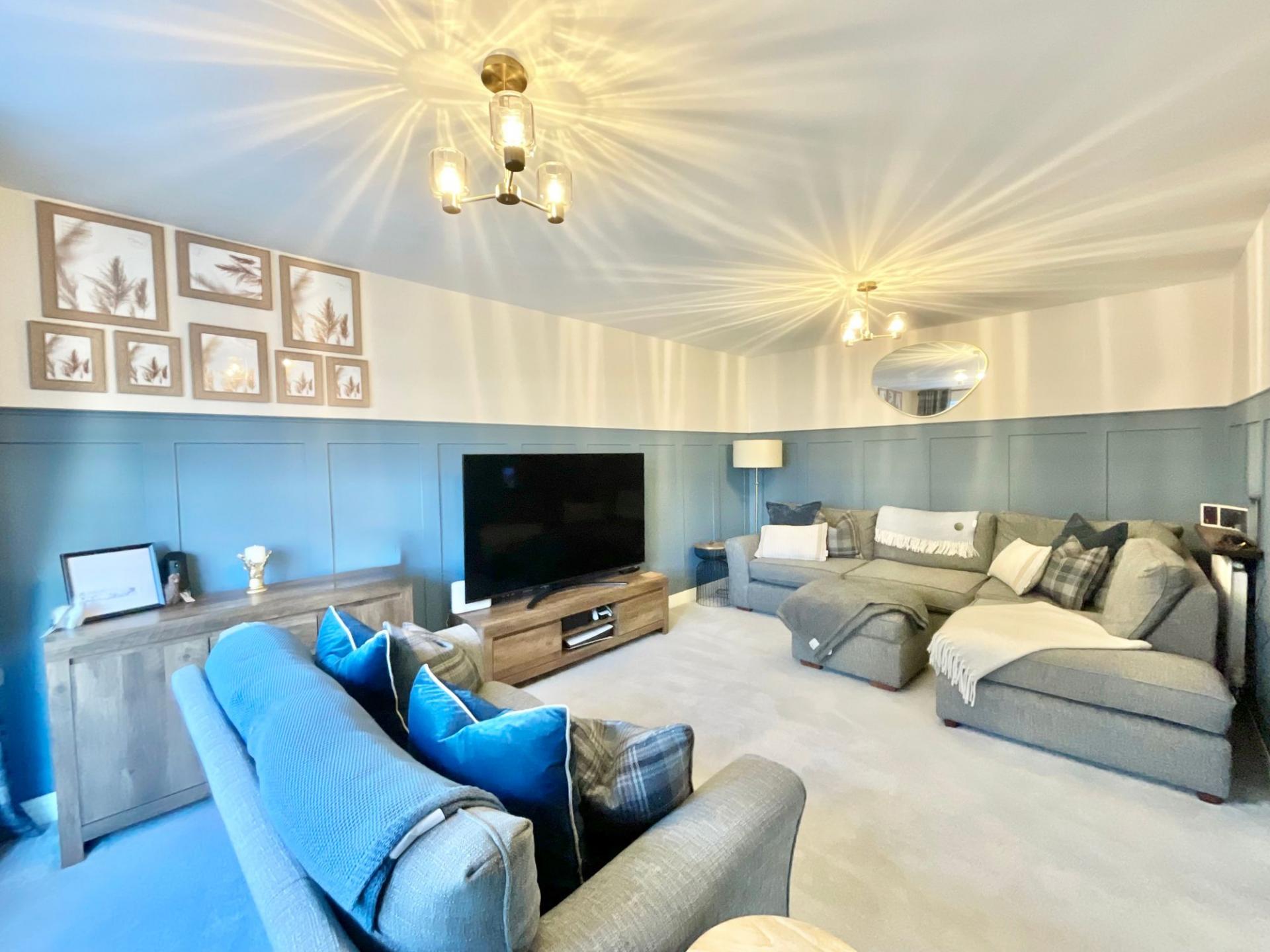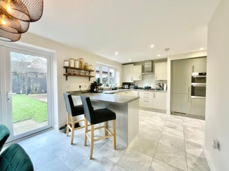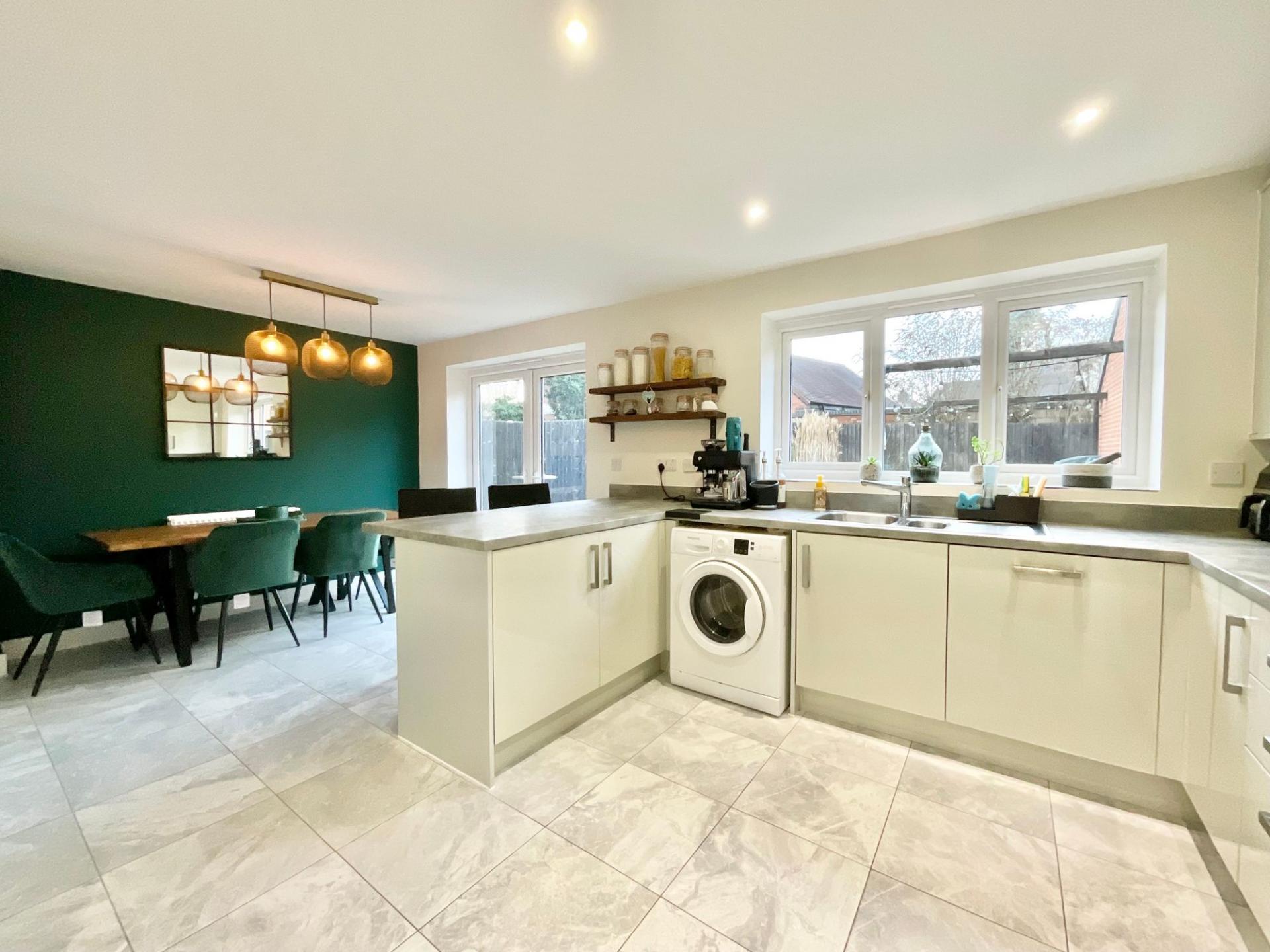 - Bright open-plan kitchen/dining area with a sleek U-shaped kitchen with matching cabinetry, a breakfast bar, and dining area. Plus a warm and inviting living room, under-stairs storage, and W/C.