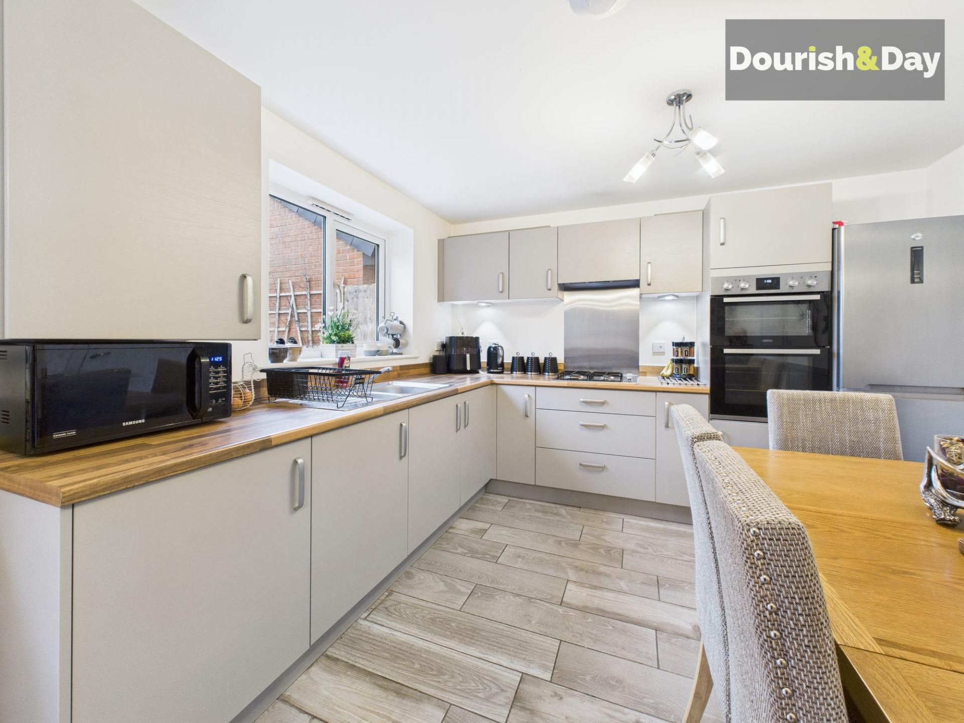 To the rear of the property sits the kitchen and dining room, offering plenty of room for a large dining table and day-to-day family use. The kitchen is modern and well presented, fitted with a double integrated oven, a four-burner hob and space for a freestanding single fridge freezer. A breakfast bar area provides additional surface space, with under-counter room for extra white goods if needed. Just off the kitchen, a tucked-away utility room offers dedicated space for a washing machine and dryer, keeping the main living areas clutter free.